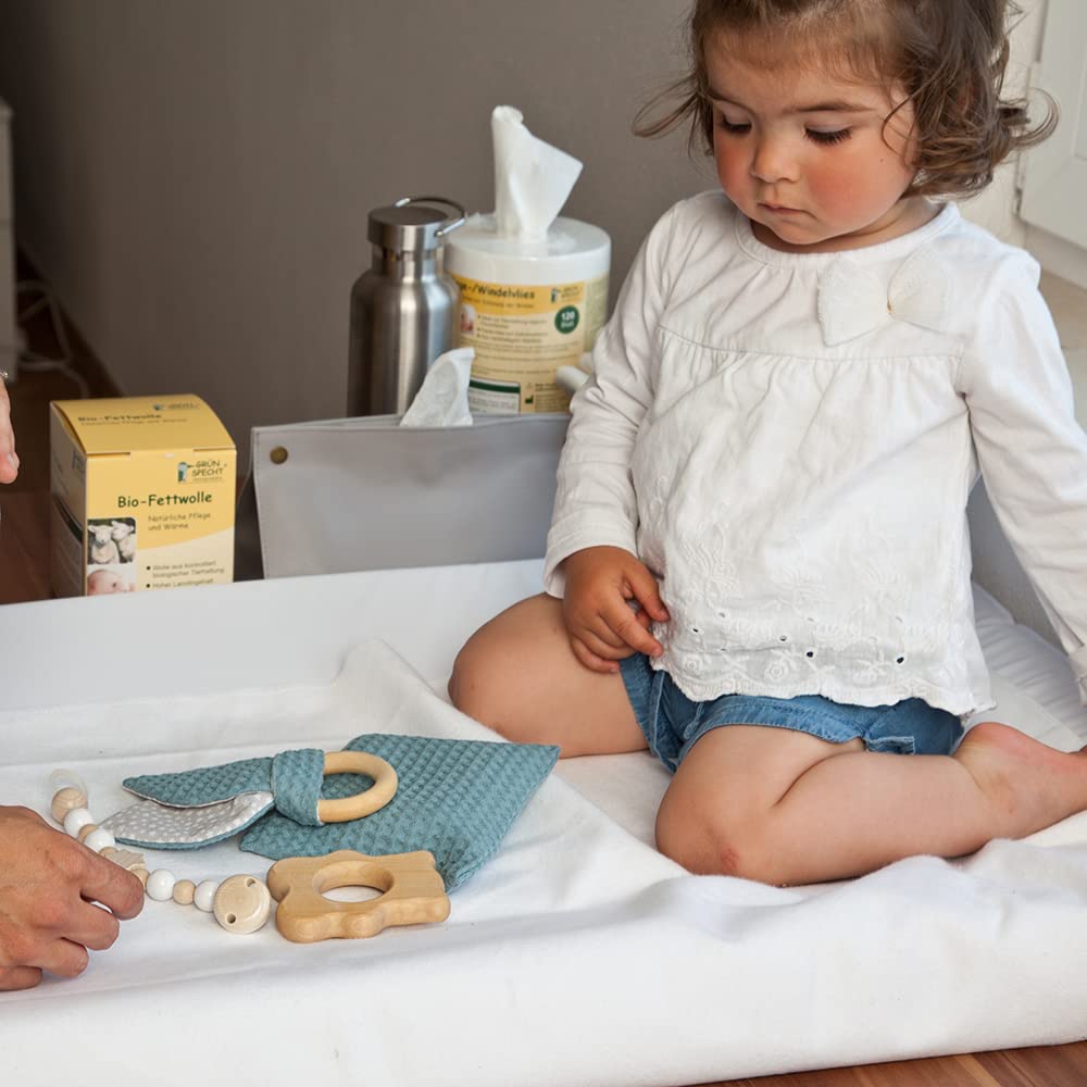 Einzelheiten: Fettwolle, im Volksmund auch „Rohwolle“ genannt, dient der natürlichen Pflege und Wärme. Sie pflegt beanspruchte Brustwarzen sowie empfindliche Babypopos und Hautpartien. Der praktische Spender ermöglicht eine sparsame Entnahme der Wolle und ist wiederverschließbar. Bei der Wolle handelt es sich um sorgfältig ausgewählte schurwolle aus kontrolliert biologischer Tierhaltung. Das Produkt darf nur einmal verwendet werden und ist nach der Anwendung zu entsorgen.
