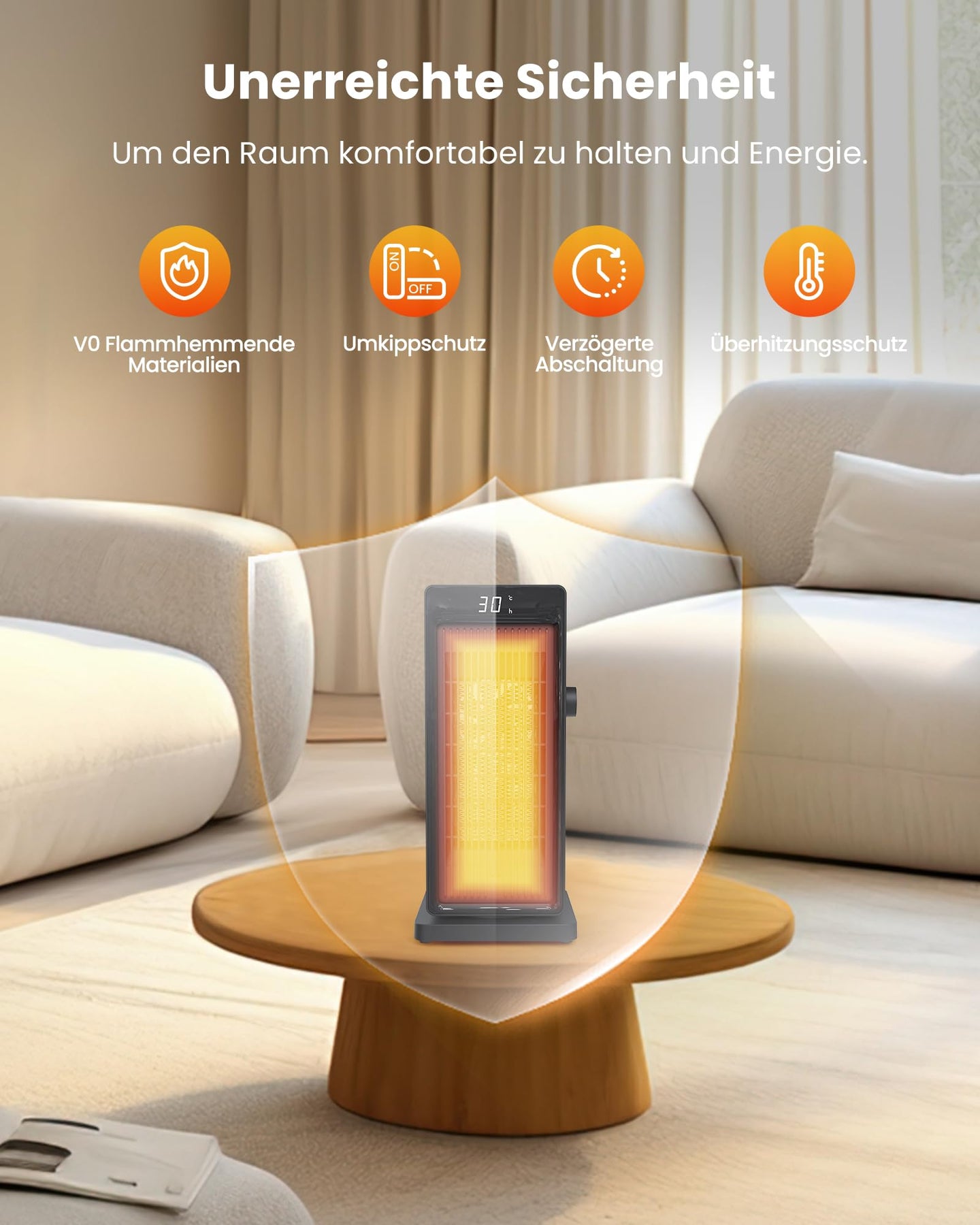 - 【Unzerbrechliche Sicherheit】 Überhitzungsschutz aus flammhemmendem PP-Material, Anti-Kipp-Funktion mit internem Kippschalter, europäischer Sicherheitsstecker, deutsches hochtemperaturkorrosionsbeständiges Netzkabel und 24-Stunden-Timer bringen weitere Überraschungen, um einen sicheren Betrieb den ganzen Tag lang zu gewährleisten. Damit Sie sich wohlfühlen, wird empfohlen, das Gerät vor dem ersten Gebrauch eine Zeit lang in einer gut belüfteten Umgebung laufen zu lassen
