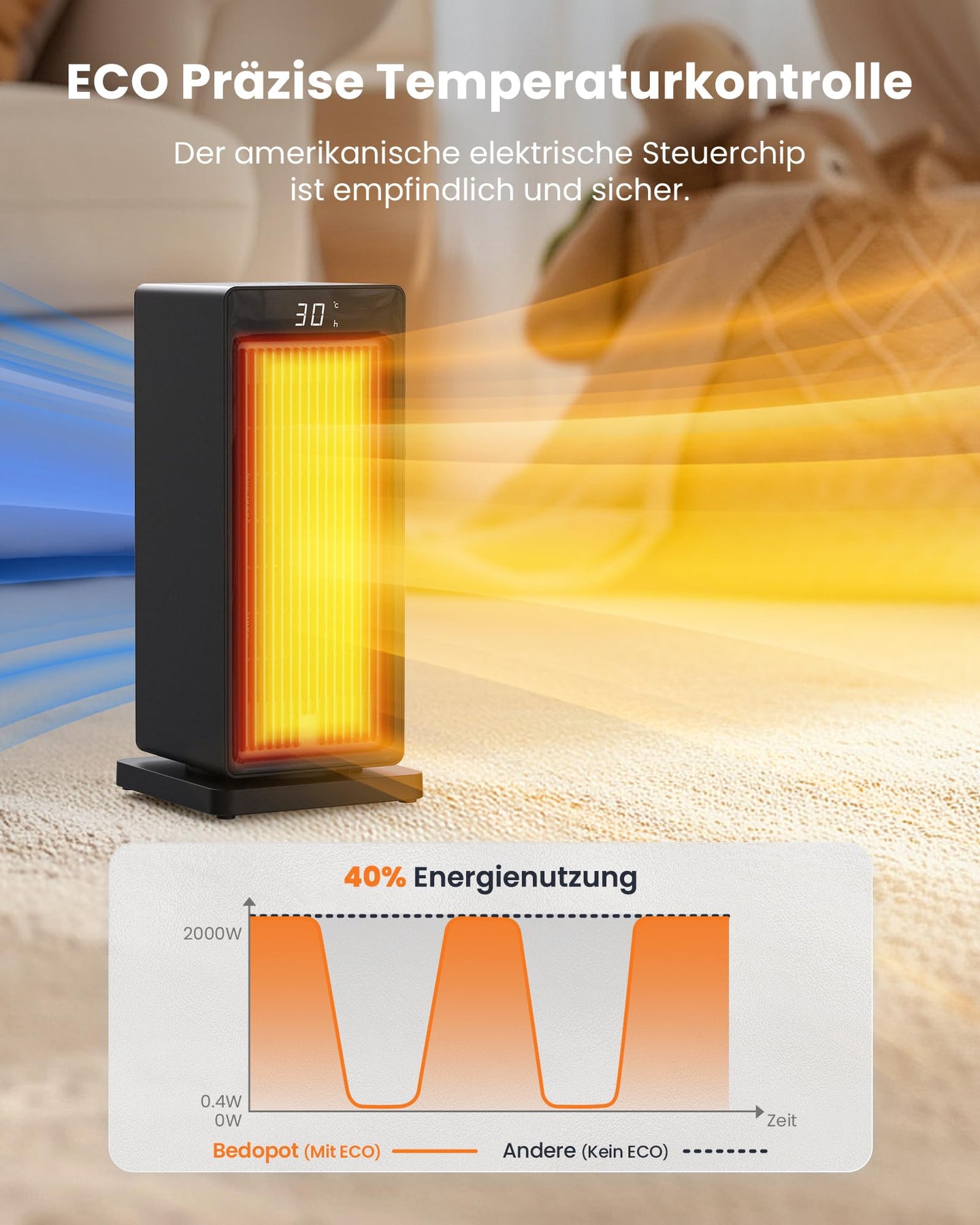 - 【ECO-Präzisions-Temperaturregelung】 Der ECO-Modus ist mit einem fortschrittlichen Temperatursensor ausgestattet, der die Heizleistung intelligent an die Innentemperatur anpasst, den Betriebszustand automatisch anpasst, um die ideale Temperatur aufrechtzuerhalten (Temperatureinstellbereich: 15°C bis 35°C), und gleichzeitig die Energienutzung optimiert, um die Stromkosten effektiv zu senken, so dass Sie sich von den Problemen eines hohen Energieverbrauchs verabschieden können