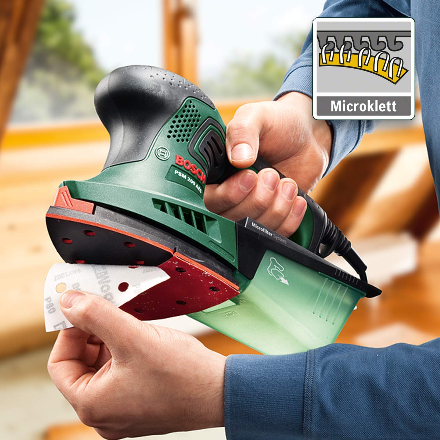 Einzelheiten: Dieser leistungsstarke Alleskö nner ermö glicht mü heloses Schleifen mittelgroß er und grö ß erer flacher Oberflä chen sowie das Schleifen von Ecken und Kanten. Der PSM 200 AES verfü gt ü ber eine dreieckige Schleifplatte fü r die Arbeit in engeren Bereichen und eine viereckige Schleifplatte fü r grö ß ere Oberflä chen. Schneller Schleifvorsatzwechsel sind dank SDS-System mö glich. Elektronische Drehzahlvorwahl sorgt fü r eine perfekte Anpassung der Drehzahl an Arbeit und Material. Der Multischleifer ist geeignet zum Schleifen von Holz, lackierten und gestrichenen Oberflä chen sowie Metall und Stein. Er bewä ltigt Projekte an Mö beln, Tü ren, Rahmen, Treppen und Bodenbelä gen. Das Microfilter-System reduziert Staub.
