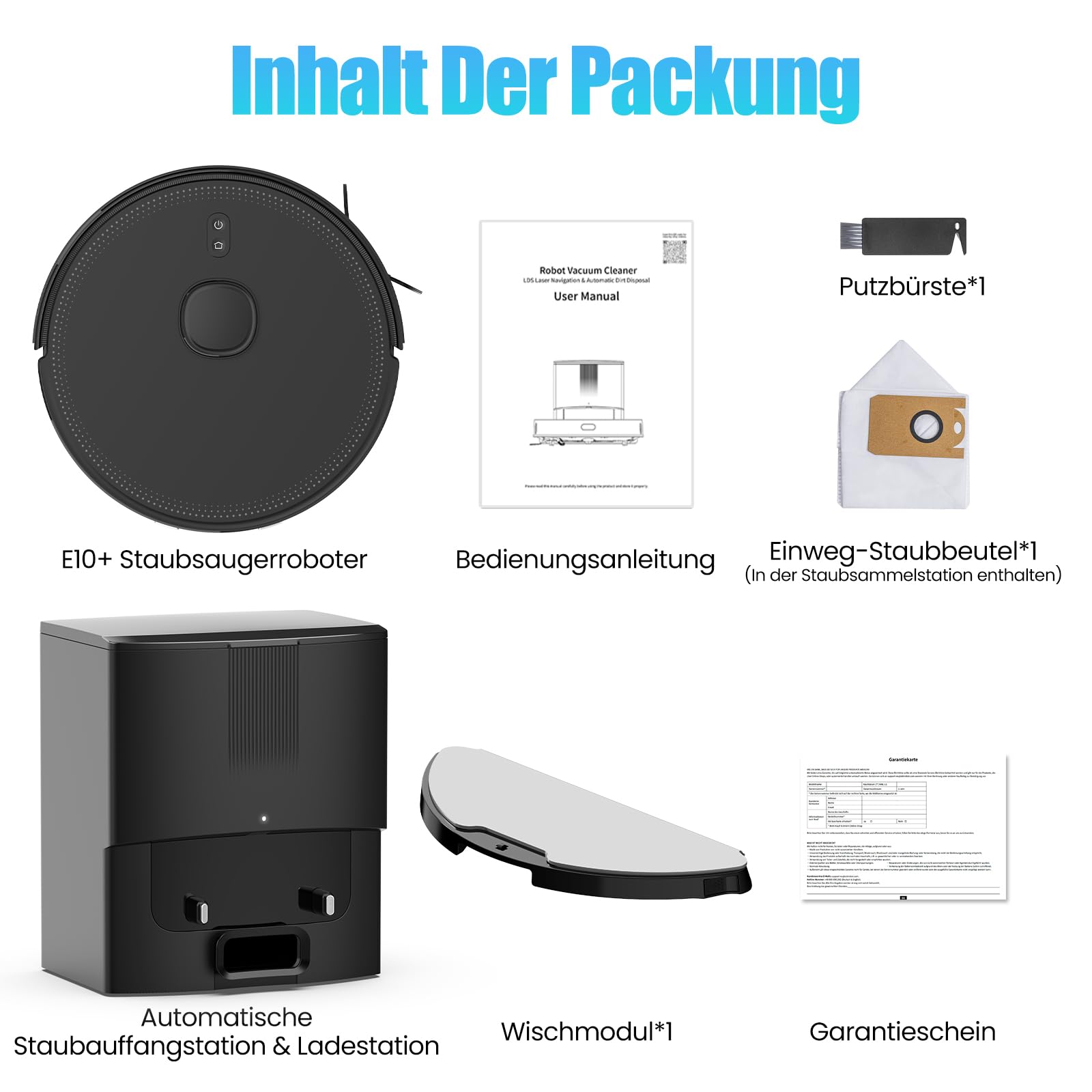 • Lieferumfang & 24 Monate Garantie: 1*E10+ Staubsaugroboter, 1*2-in-1 Staub- und Wasserbehälter, 1*Hauptbürste, 1*Hauptbürstenabdeckung, 1*Putzbürste, 1*Einweg-Staubbeutel, 1*Seitenbürste, 1*Wischmodul, 1*Benutzerhandbuch. BOTLUXE Wisch und saugroboter versprechen 24 Monate Garantie, sorgenfreier Kundendienst.