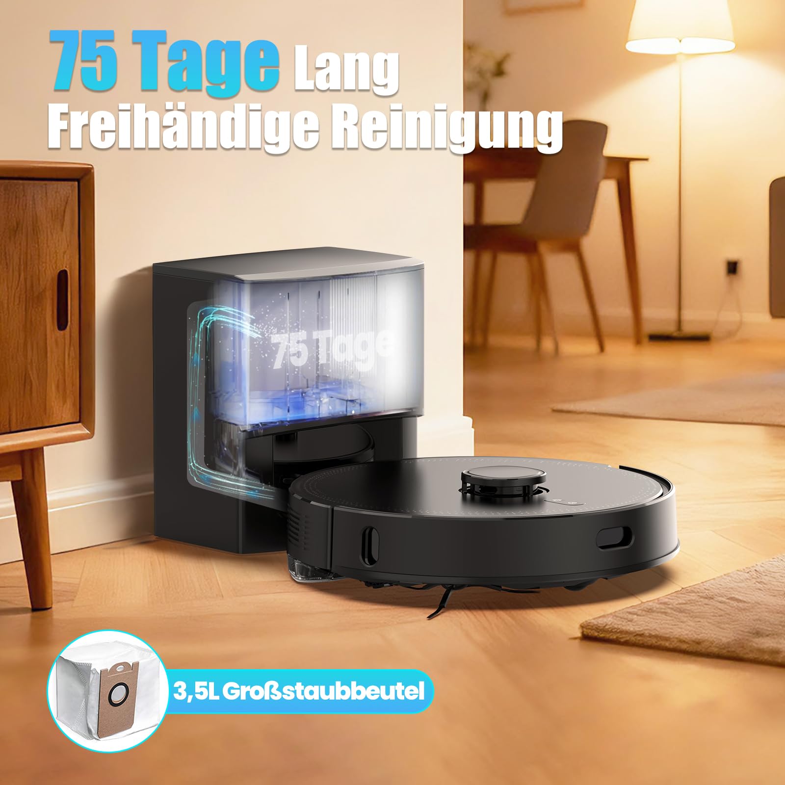 • 75 Tage Freihändig: Der Saugroboter mit Absaugstation verfügt über einen 3,5L Staubbehälter, der automatisch Schmutz sammelt. Dadurch können Sie bis zu 75 Tage lang das Leeren des Staubbehälters vermeiden. Ideal für vielbeschäftigte Familien und Haustierbesitzer.