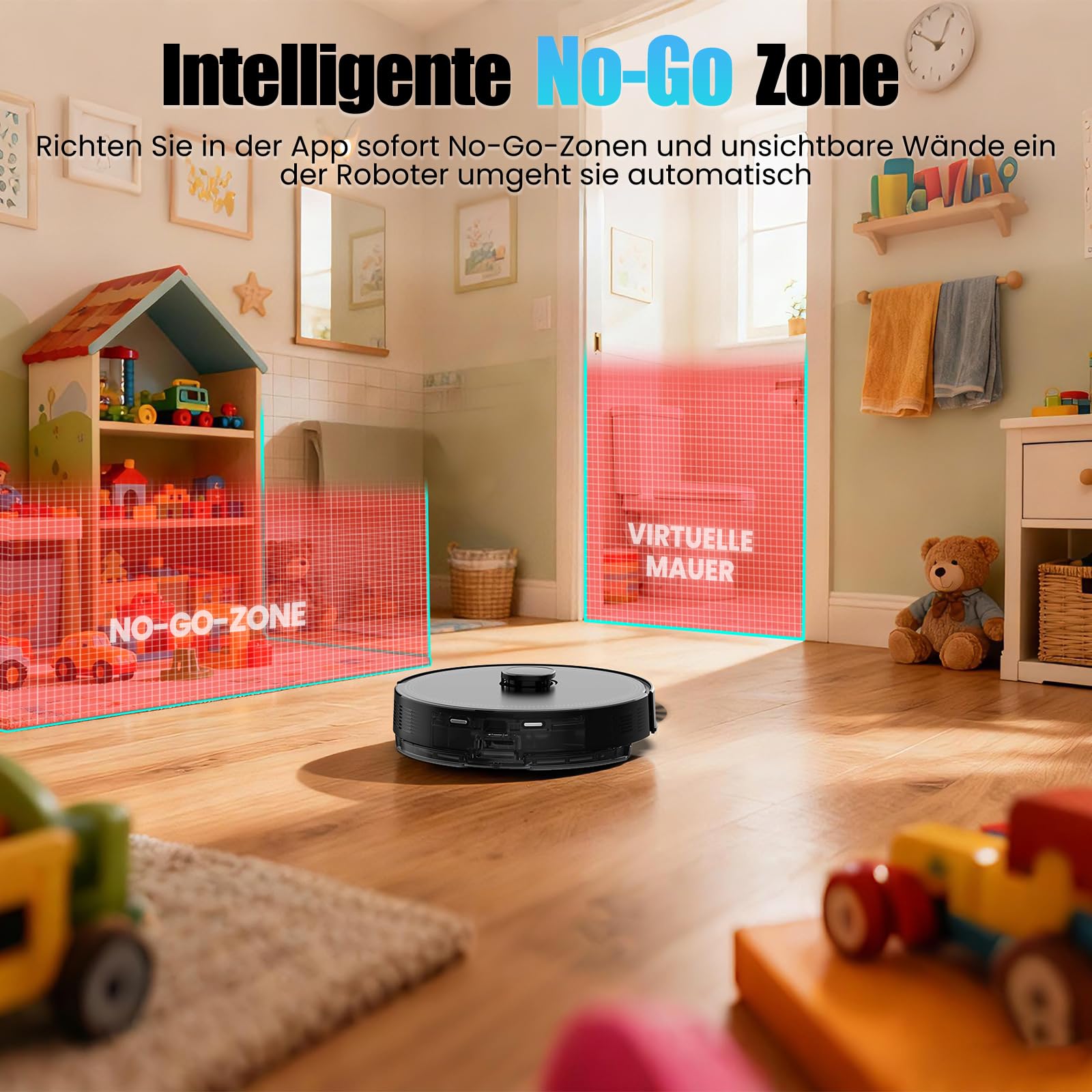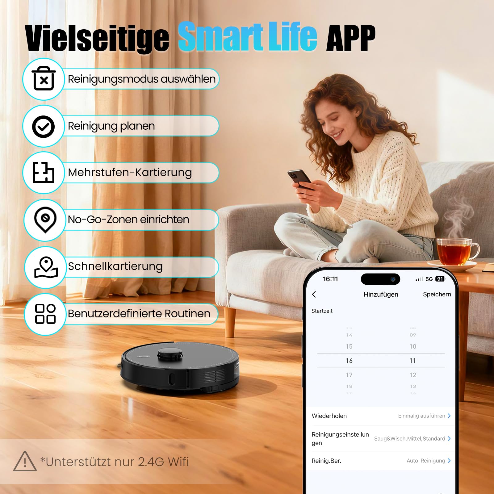 • APP-Smart-Steuerung: Dieser Staubsauger Roboter mit Absaugstation mit Wischfunktion kann über die Smart Life App gesteuert werden.. Sie können die Reinigungszeit und die Reihenfolge des Roboters festlegen, den gewünschten Reinigungsmodus auswählen, bestimmte Räume reinigen, virtuelle Wände und Sperrzonen einrichten usw. Sie können die Reinigung über Alexa und Google Assistant starten oder stoppen.