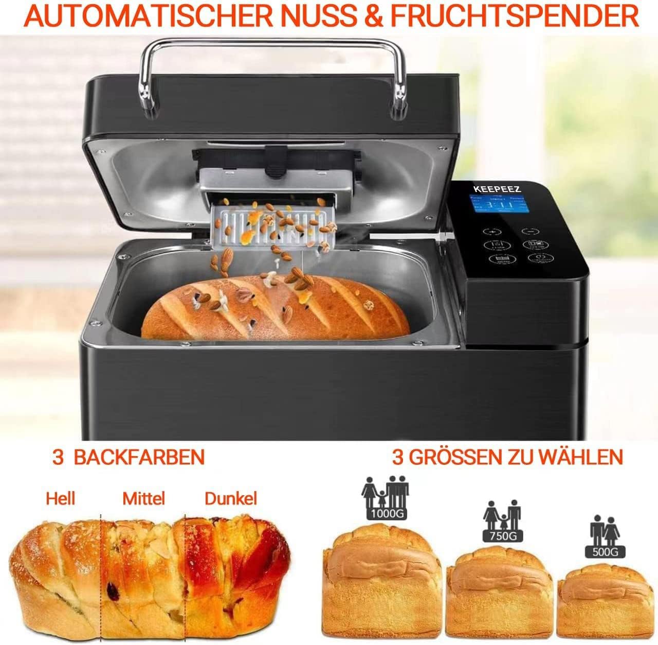 - 17 CUSTOM MENÜS, SMART FRUIT & NUT DISPENSER & MAGIC MIXING STICK: Der KEEPEEZ brotbackautomat hat 17 programme zur auswahl (Glutenfrei, Vollkorn, Sauerteig, Kuchen, etc.). Der herausnehmbare spender ist gesünder, sicherer und leichter zu reinigen. Der spender gibt die zutaten automatisch zum optimalen zeitpunkt in den Toaster ab. Der keramikrührer hat eine große kontaktfläche, die eine schnelle teigformung ermöglicht. Hochleistungs-brotbackautomat ohne loch im brot-Teig ist zäh