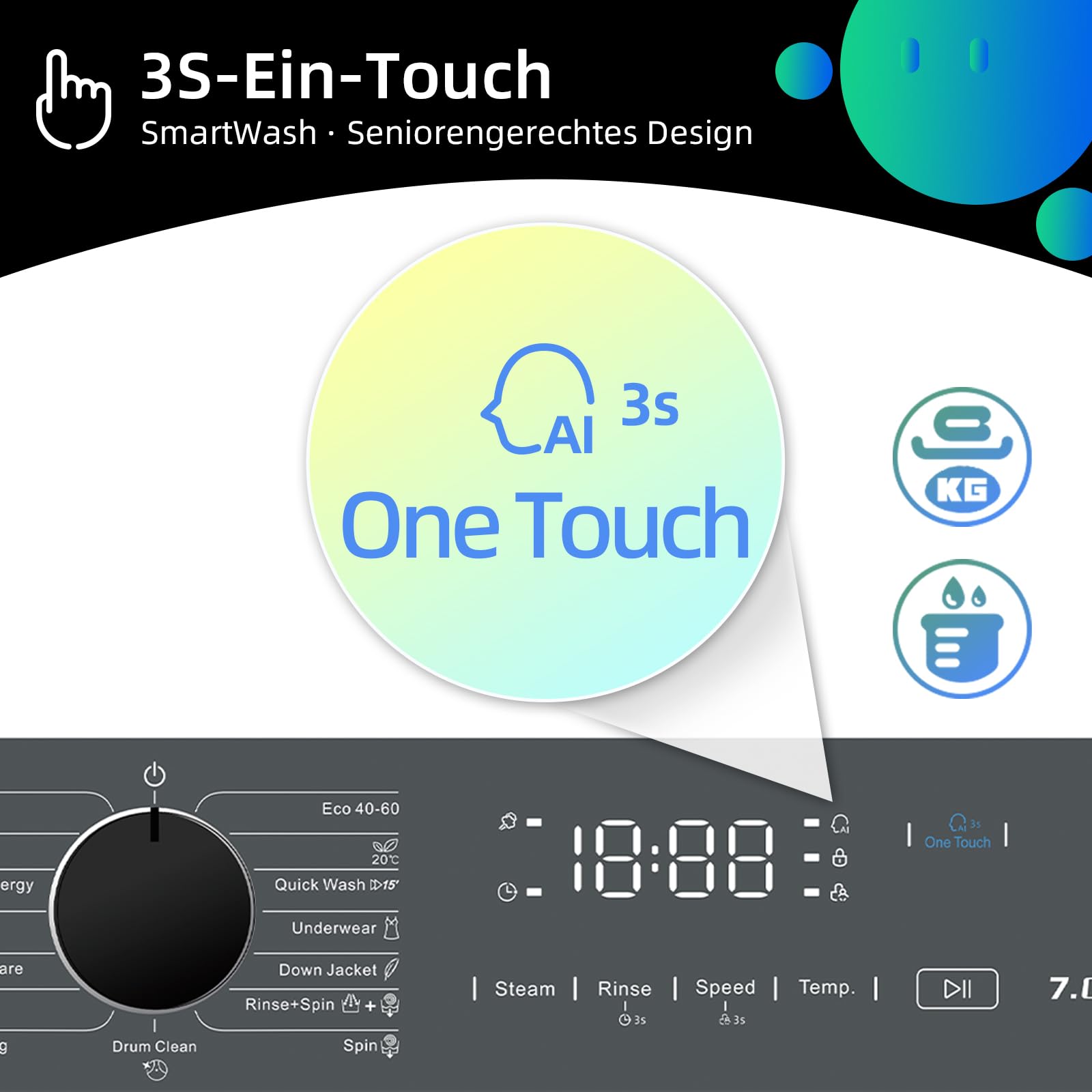 - Intelligente Waschlösungen: 15 Spezialprogramme (Babywäsche/Wolle/Feinwäsche) + 15-Minuten-Schnellwäsche für alle Textilarten. 3-Sekunden-Startfunktion und automatische Wasserstandsanpassung.