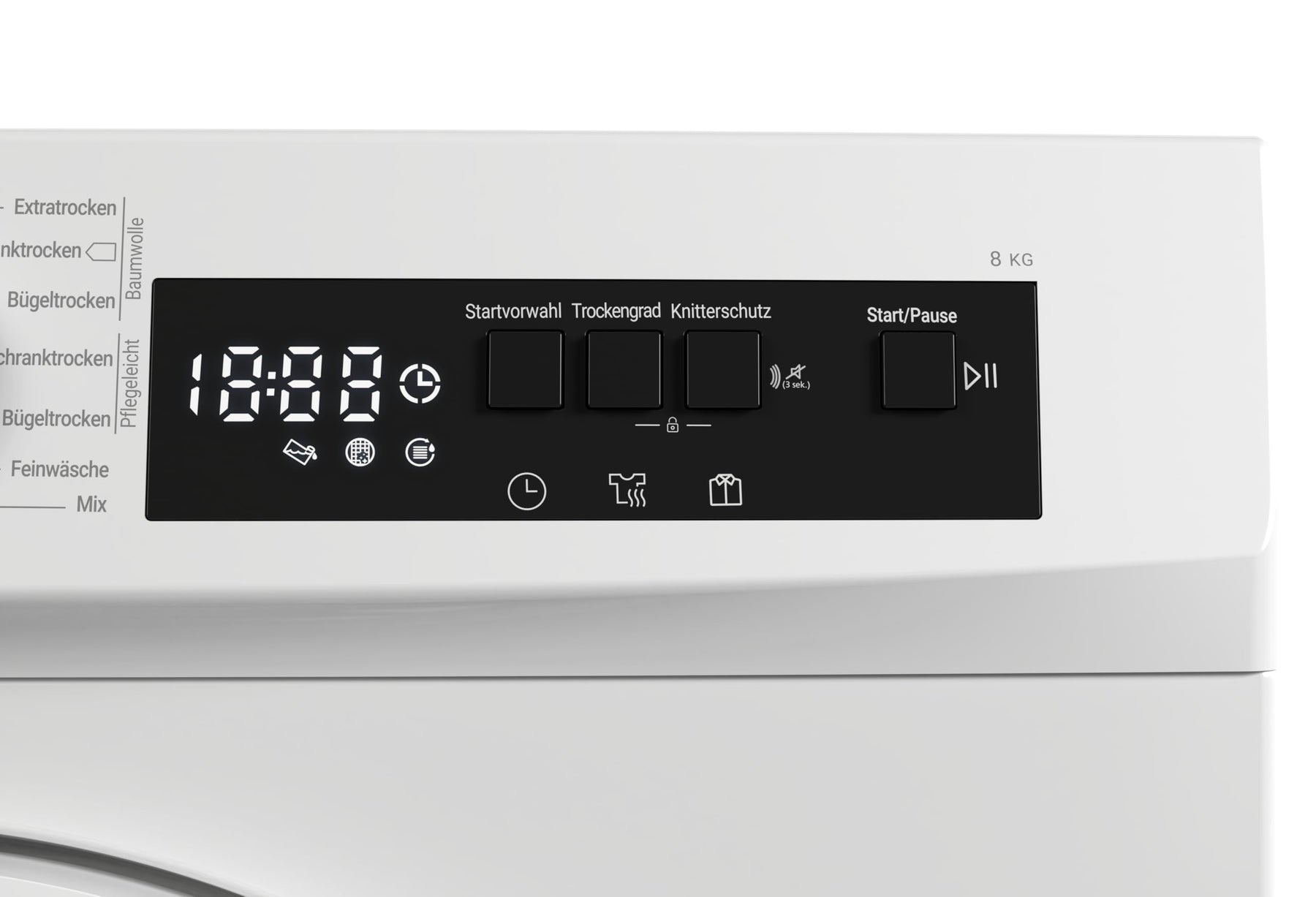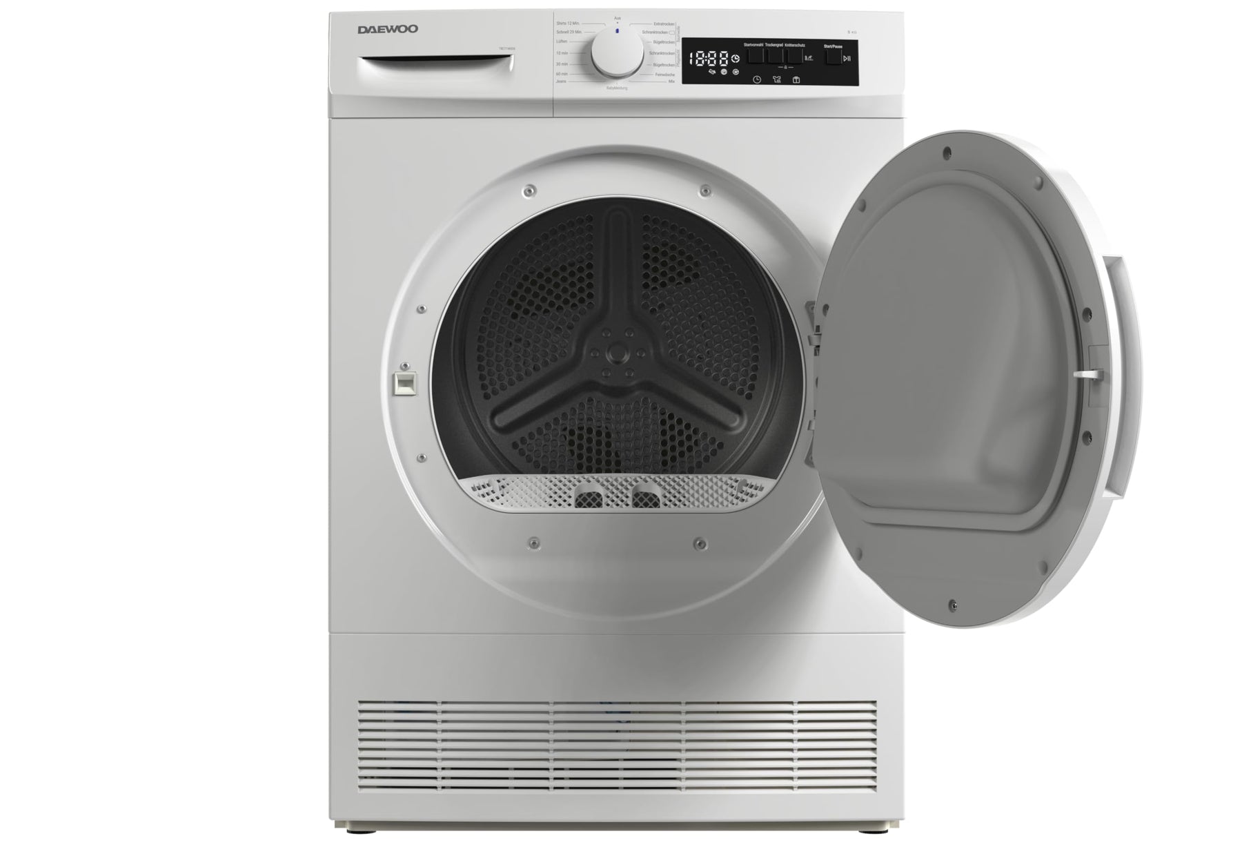 Daewoo T8CT1W0DE Kondenstrockner Frontlader, B, 8 kg, 15 Programme mit 12 Min.-Kurzprogramm, Startzeitvorwahl, LED-Trommelbeleuchtung, Weiß