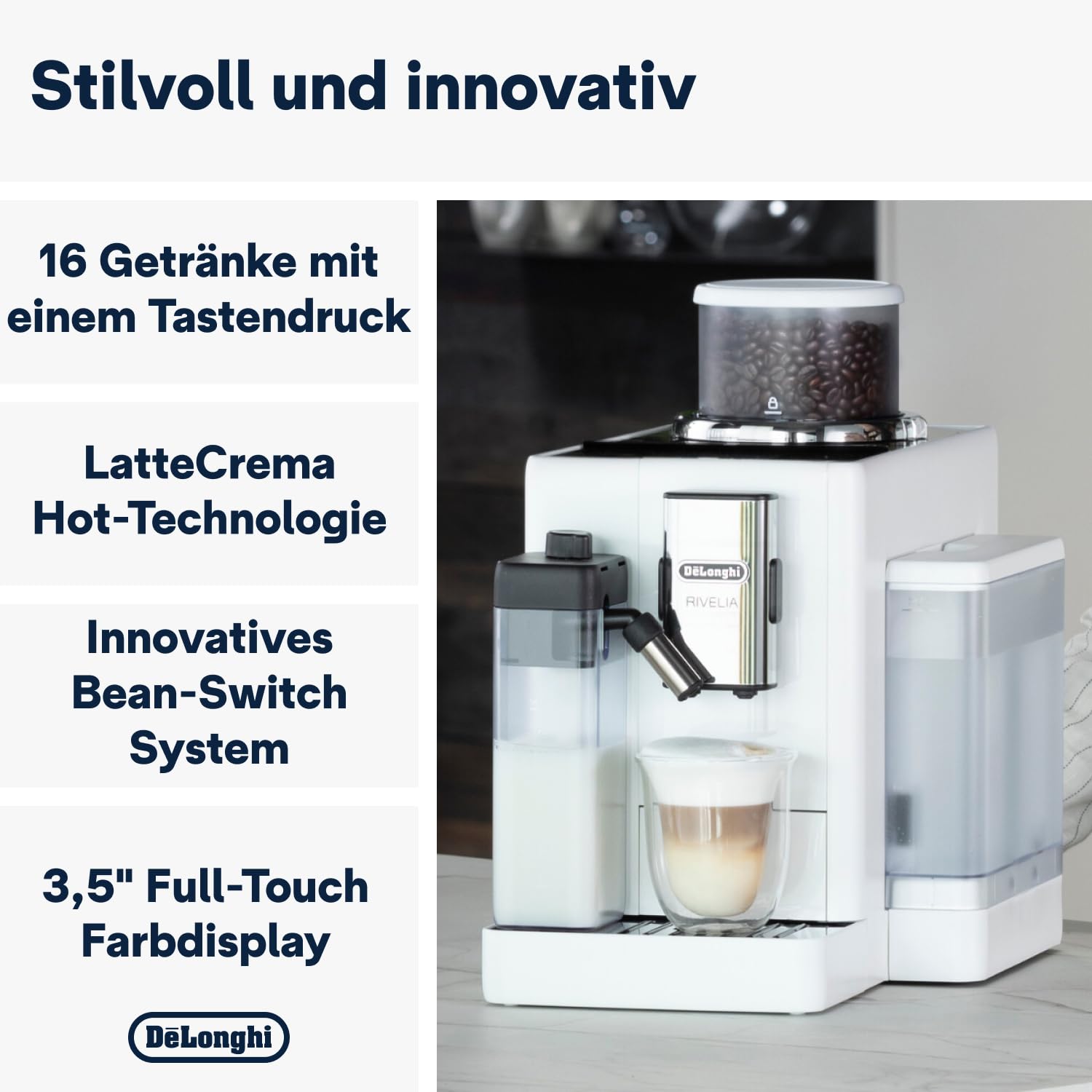 Einzelheiten: Entdecken Sie unzählige Kaffeesorten mit Rivelia von De'Longhi und seinem Bean Switch-System. Genießen Sie ein immersives Erlebnis mit einem 3,5-Zoll-Vollfarb-Touchscreen mit benutzerdefinierten Animationen und Kaffeemaschinen-Routinen. Genießen Sie feinen und reichhaltigen Schaum mit LatteCrema Hot in einer kompakten Kaffeemaschine, die zu Ihrem Stil passt.