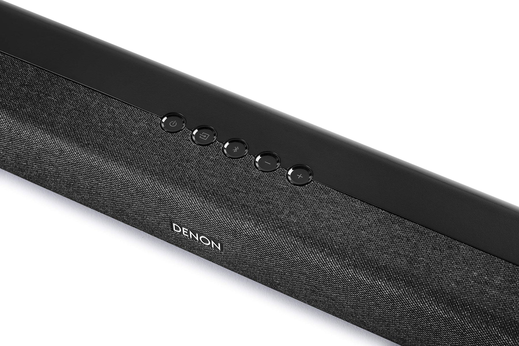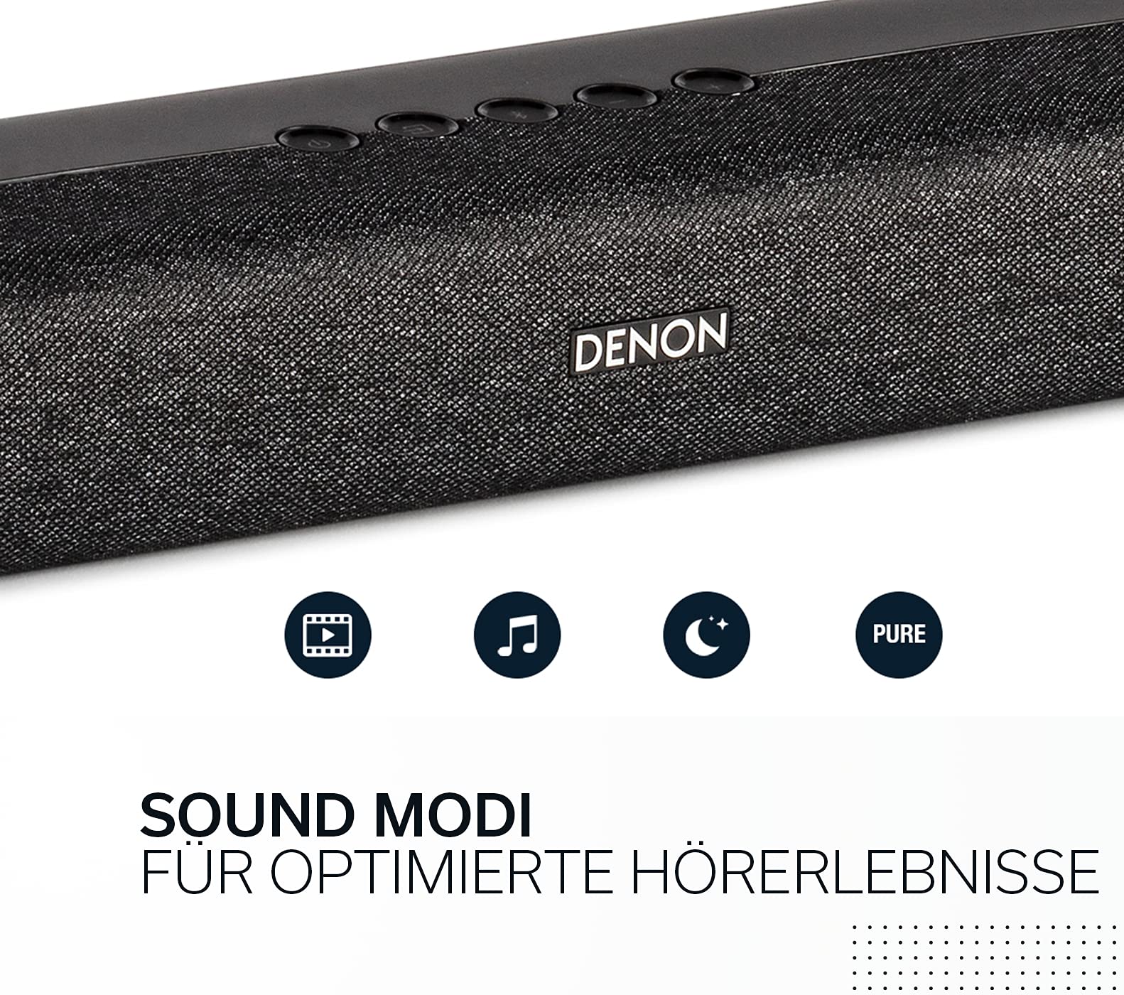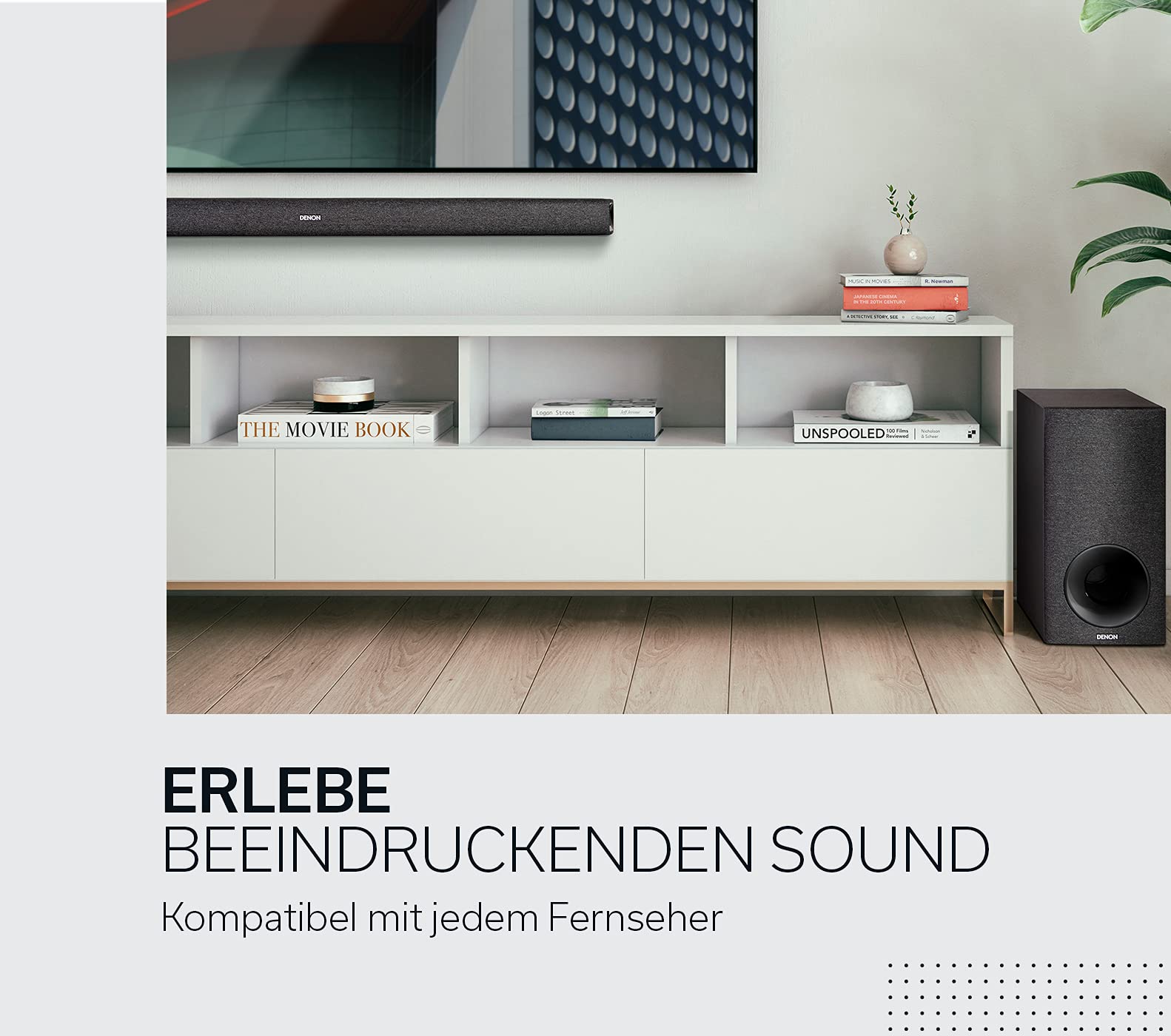 Einzelheiten: Genießen Sie packendes Entertainment und mitreißenden Surround Sound. Wie Sie es vom Marktführer für AV-Receiver erwarten würden, verwandelt die Denon DHT-S416 jeden Fernseher in ein Home Entertainment Center. Die flache, wandmontierbare Soundbar unterstützt Dolby Digital 5.1 Decoding für ein leistungsstarkes Heimkino-Surround-Sound-Erlebnis. Verbinden Sie die Soundbar einfach über HDMI ARC mit Ihrem TV für hervorragende Audioqualität. Nutzen Sie Google Chromecast, um über WLAN Hi-Res Audio von Ihren Lieblings-Musikdiensten zu streamen, inklusive Google Play Music, YouTube Music, Amazon Music HD, Spotify, TIDAL, Deezer und mehr. Die DHT-S416 ist sowohl mit Smart-, HD- als auch 4K-TVs kompatibel. Verwenden Sie das mitgelieferte HDMI-Kabel, um Ihren Fernseher über den HDMI Audio Return Channel (ARC) an den DHT-S416 anzuschließen. Falls Ihr TV über keinen HDMI ARC-Anschluss verfügt, kann die DHT-S416 über eine den optischen Eingang angeschlossen werden. Sorgfältig entwickelte Treiber und Elektronik liefern beeindruckende Heimkinoerlebnisse mit virtuellem Surround Sound. Genießen Sie kristallklare Dialoge bei Filmen und Serien mit komplexen Audiospuren. Genießen Sie virtuellen Surround Sound von Blu-rays, Gaming-Konsolen und TV-Apps dank Dolby Digital Decoding. Nutzen Sie Google Chromecast, um über WLAN Hi-Res Audio von Ihren Lieblings-Musikdiensten zu streamen, inklusive Google Play Music, YouTube Music, Amazon Music HD, Spotify, TIDAL, Deezer, Qobuz und mehr. Steuern Sie Ihre Musik mit einem Google Assistant Gerät Play, Pause und Lautstärke anpassen. Über die Google Home App können Sie die DHT-S416 mit anderen Chromecast-fähigen Lautsprechern koppeln, um Musik in Ihrem gesamten Zuhause abzuspielen. Spielen Sie Musik über Bluetooth direkt von Ihrem Smartphone, Tablet oder anderen kompatiblen Geräten ab. Durch den Denon Dialogue Enhancer wird die Sprachverständlichkeit in drei verschiedenen Modi verbessert ideal für Filme und Serien. Sie können auch die Stimmlautstärke erhöhen, ohne die Gesamtlautstärke anzuheben. Dank der drei verschiedenen Sound Modi - Film, Nacht und Musik haben Sie bei jeder Gelegenheit den perfekten Sound. Für Klang in seiner reinsten Form wird beim Denon Pure Audio Modus die Surround-Verarbeitung abgeschaltet, indem alle angepassten Audio-Charakteristika entfernt werden. Mit einer Höhe von etwa 5,6 cm blockiert die Soundbar nicht die Unterkante oder den IR Sensor Ihres TVs. Dank der mitgelieferten Montageschablone ist auch die Wandmontage ein Kinderspiel. Verbinden Sie die DHT-S416 über das mitgelieferte HDMI-Kabel oder den optischen Eingang mit Ihrem TV. Sobald die Soundbar über HDMI ARC angeschlossen ist, können Sie die Lautstärke mit Ihrer TV-Fernbedienung steuern.