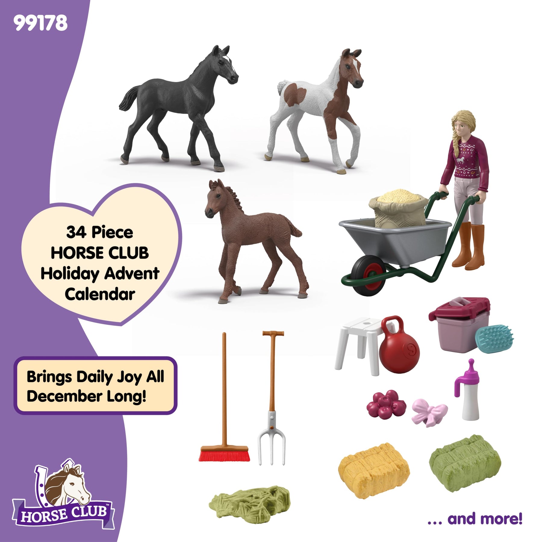 Das Highlight: die drei Fohlen sind exklusiv nur in diesem Kalender enthalten und machen das Set zu einem wertvollen Teil jeder Sammlung von Schleichpferden und Sammelfiguren. Ob beim Versorgen mit Putzzeug, beim Reiten im Stall oder einfach beim kreativen Spielen – dieser Adventskalender verbindet Fürsorge, Fantasie und festliche Vorfreude auf ganz besondere Weise.