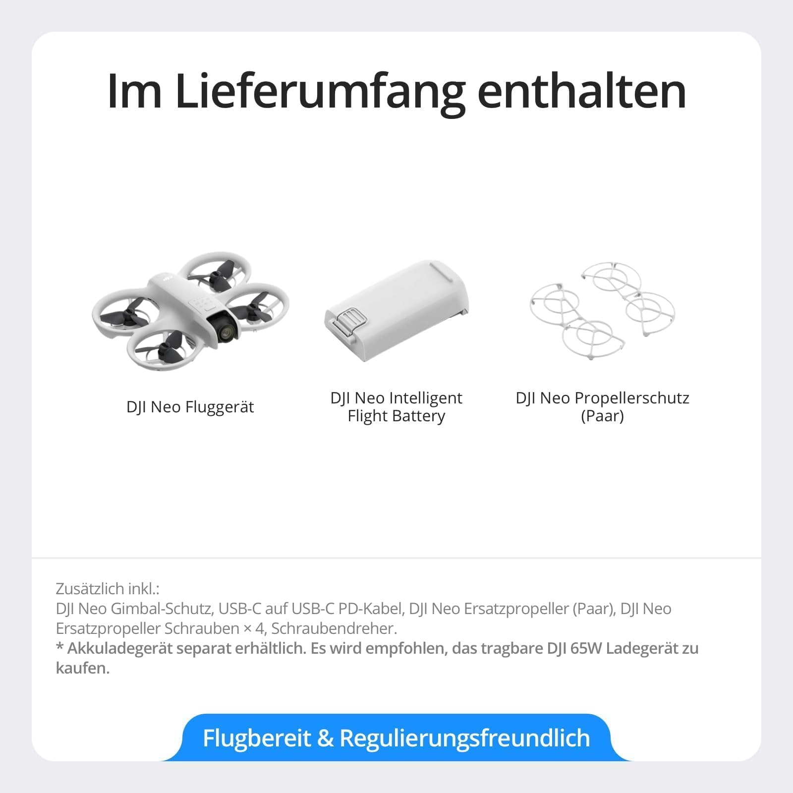 - Die DJI Neo wird standardmäßig mit einem Akku, Propellerschutz und mehr geliefert und kann ohne Controller oder mit einem Smartphone verwendet werden.