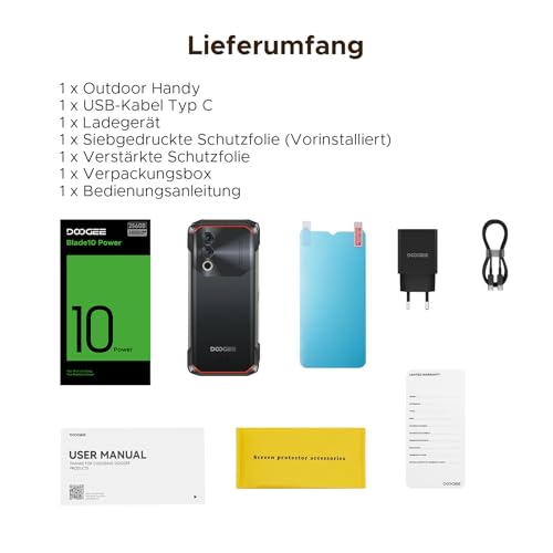 - 👍👍【IP68/IP69K & MIL-STD-810H】DOOGEE Blade10 Power ist IP68/IP69K zertifiziert und wasser, staub- und stoßfest. Es übersteht Stürze aus bis zu 1,5 Metern Höhe sowie das Eintauchen in Wasser derselben Tiefe und ist somit ein idealer Begleiter für extreme Umgebungen. Sein 360°Staubschutz sorgt dafür, dass Ihr Gerät immer sicher ist. Blade10 kann Sie in jeder rauen Außenumgebung schützen. Dieses DOOGEE blade10 Power Outdoor Smartphone ist die beste Wahl für Outdoor Entdecker und Bauarbeiter