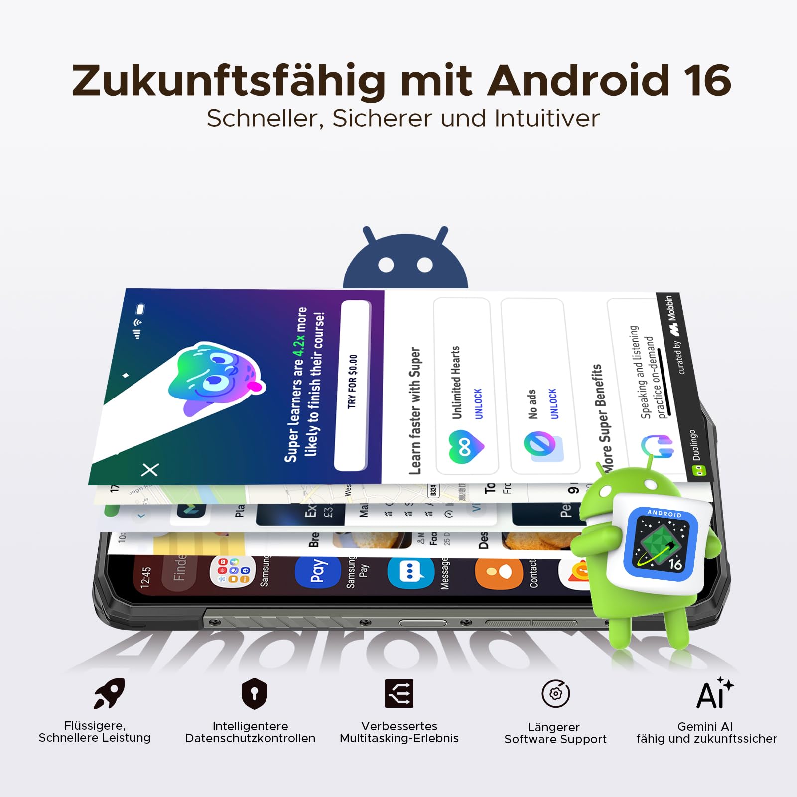 - 👑👑 【Neueste Android 16 & Gemini AI】DOOGEE Blade10 Power Outdoor Handy Ohne Vertrag läuft mit dem neuesten Android 16 und verbessert so Benutzerfreundlichkeit, Datenschutz und individuelle Anpassungsmöglichkeiten. verbessert die Verwaltung und den Schutz der Gerätedaten., Der Die intelligente Gemini AI Funktion ermöglicht Multitasking und optimiert automatisch verschiedene Geräteaktivitäten. DOOGEE Blade10 Power Android 16 Outdoor Smartphone wird Ihr bester Partner im Alltag und bei der Arbeit
