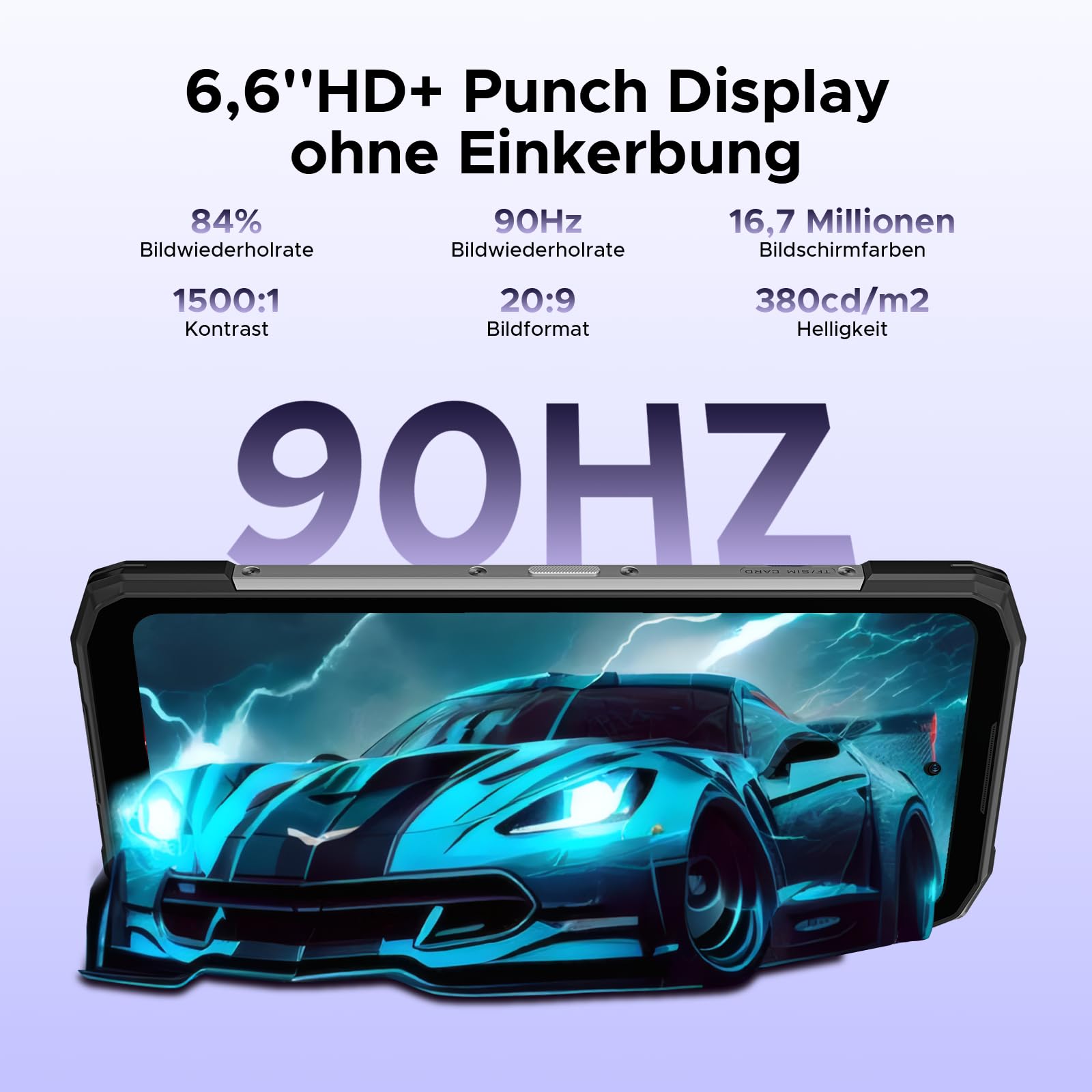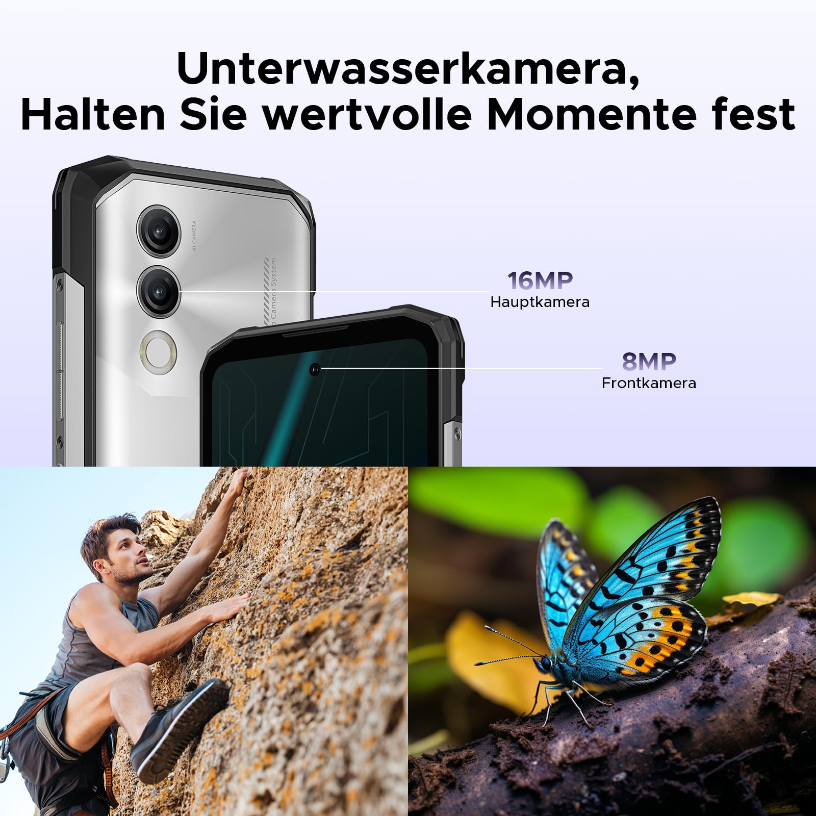 - 【6,6'' Punch Display ohne Einkerbung & 90Hz & 16MP】DOOGEE Blade 20 Android 15 Outdoor Handy Ohne Vertrag hat Punch Display ohne Einkerbung, das Vollbilddesign erweitert Ihr Sichtfeld und zeigt mehr Inhalt auf der gleichen Bildschirmgröße an. Outdoor Smartphone verfügt über eine Bildwiederholfrequenz von 90 Hz, eine ultraempfindliche Berührungsreaktion und eine farbenfrohe, seidige Glätte.16MP AI Hauptkamera in Kombination mit der 8MP Frontkamera können auch unter Wasser fotografieren