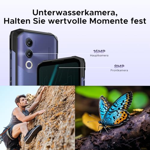 - 【6,6'' Punch Display ohne Einkerbung & 90Hz & 16MP】DOOGEE Blade 20 Android 15 Outdoor Handy Ohne Vertrag hat Punch Display ohne Einkerbung, das Vollbilddesign erweitert Ihr Sichtfeld und zeigt mehr Inhalt auf der gleichen Bildschirmgröße an. Outdoor Smartphone verfügt über eine Bildwiederholfrequenz von 90 Hz, eine ultraempfindliche Berührungsreaktion und eine farbenfrohe, seidige Glätte.16MP AI Hauptkamera in Kombination mit der 8MP Frontkamera können auch unter Wasser fotografieren