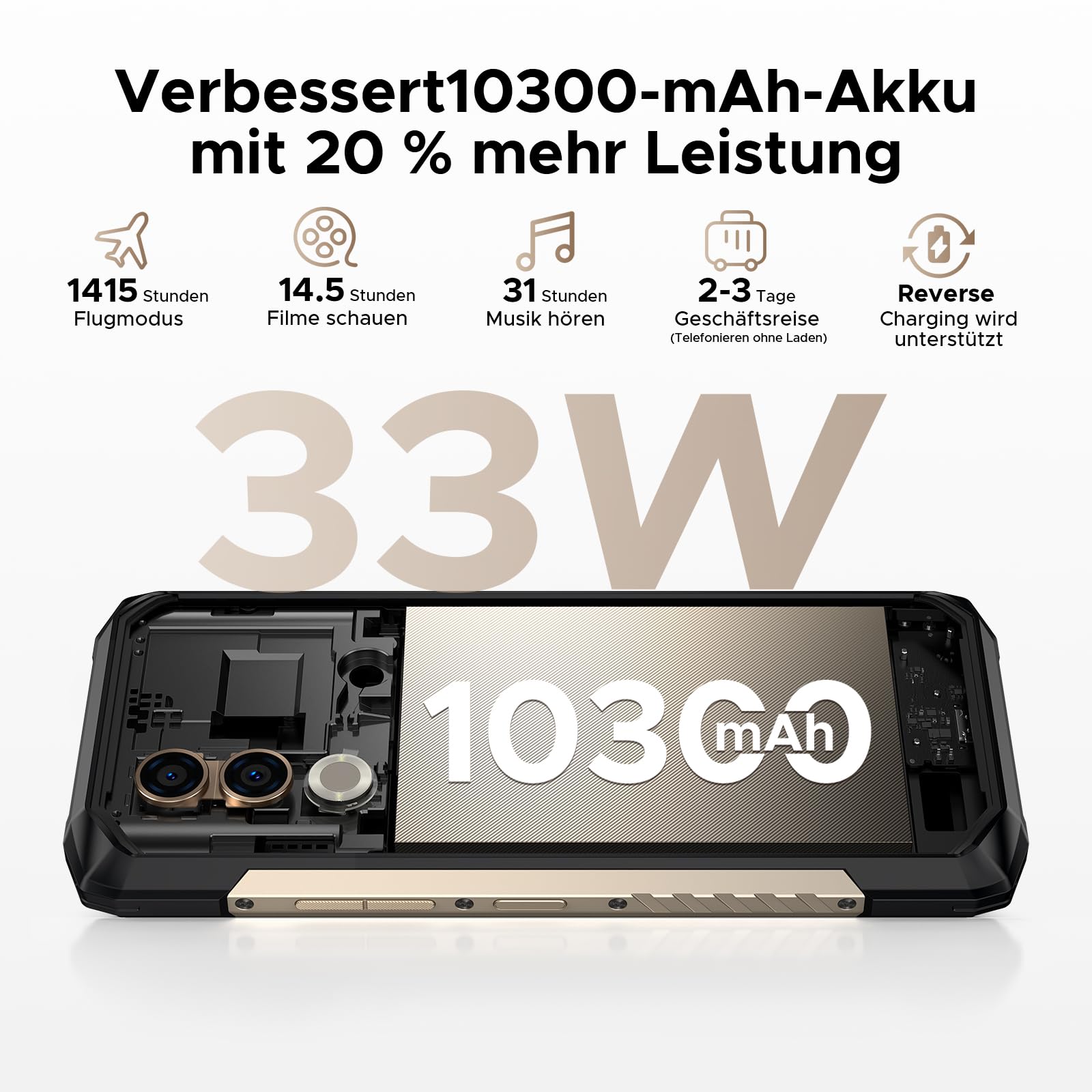 - 🔋🔋【10300mAh Akku & 33W Schnellladung & OTG】DOOGEE Blade 20 Turbo Outdoor Handy ohne vertrag ist mit einem leistungsstarken 10300mAh großen Akku und einer 33W Schnellladefunktion ausgestattet, die Ihr Outdoor Abenteuer kontinuierlich mit Strom versorgen kann, egal wie lange Ihre Aktivität dauert. Mit der OTG Funktion kann das DOOGEE Blade 20 Turbo Outdoor Handy in Notsituationen in einen mobilen Energiespeicher und einen zuverlässigen Partner für Ihre zukünftigen Abenteuer verwandelt werden.