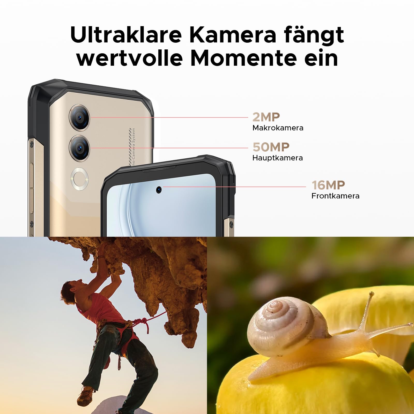 - 📸📸【50MP AI Hauptkamera & 16MP Frontkamera & Face ID】 DOOGEE Blade 20 Turbo Outdoor Handy ohne vertrag ist mit einer 50MP Haupt AI Kamera und einer 16MP Frontkamera mit Funktionen wie HDR, Bild usw, um noch mehr schöne Momente festzuhalten. 5G Smartphone unterstützen die intelligente Erkennung durch Google AI und machen Ihr Leben intelligenter. Darüber hinaus ermöglicht Ihnen die integrierte Gesichtsentsperrfunktion des DOOGEE Blade 20 Turbo einen schnellen und sicheren Zugriff auf Ihr smartphone.