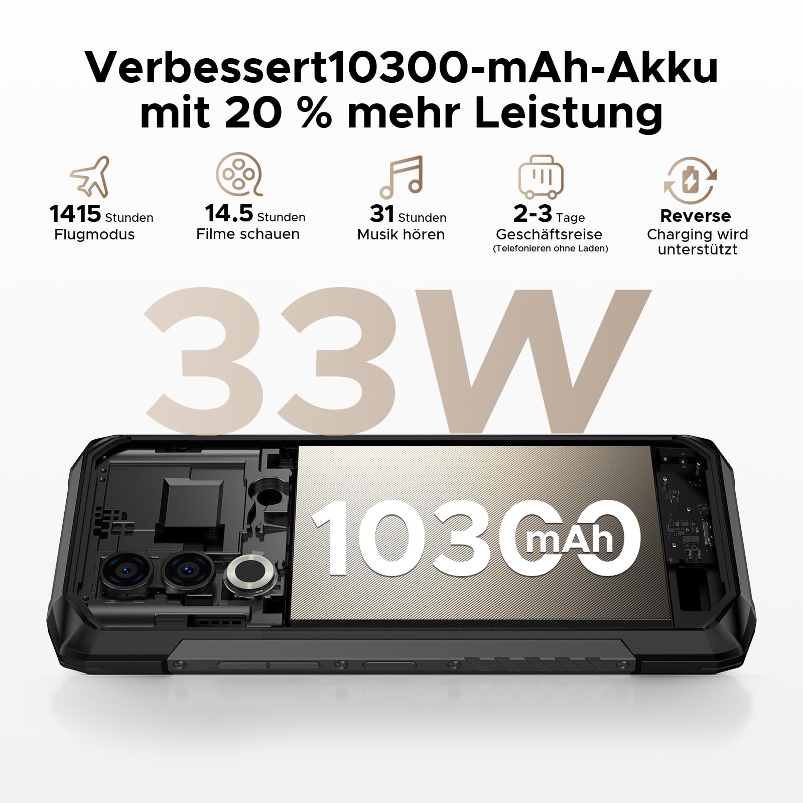 - 🔋🔋【10300mAh Akku & 33W Schnellladung & OTG】DOOGEE Blade 20 Turbo Outdoor Handy ohne vertrag ist mit einem leistungsstarken 10300mAh großen Akku und einer 33W Schnellladefunktion ausgestattet, die Ihr Outdoor Abenteuer kontinuierlich mit Strom versorgen kann, egal wie lange Ihre Aktivität dauert. Mit der OTG Funktion kann das DOOGEE Blade 20 Turbo Outdoor Handy in Notsituationen in einen mobilen Energiespeicher und einen zuverlässigen Partner für Ihre zukünftigen Abenteuer verwandelt werden.