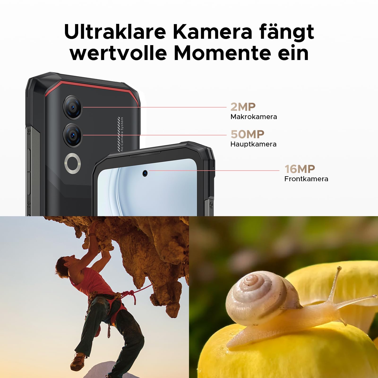 - 📸📸【50MP AI Hauptkamera & 16MP Frontkamera & Face ID】 DOOGEE Blade 20 Turbo Outdoor Handy ohne vertrag ist mit einer 50MP Haupt AI Kamera und einer 16MP Frontkamera mit Funktionen wie HDR, Bild usw, um noch mehr schöne Momente festzuhalten. 5G Smartphone unterstützen die intelligente Erkennung durch Google AI und machen Ihr Leben intelligenter. Darüber hinaus ermöglicht Ihnen die integrierte Gesichtsentsperrfunktion des DOOGEE Blade 20 Turbo einen schnellen und sicheren Zugriff auf Ihr smartphone.
