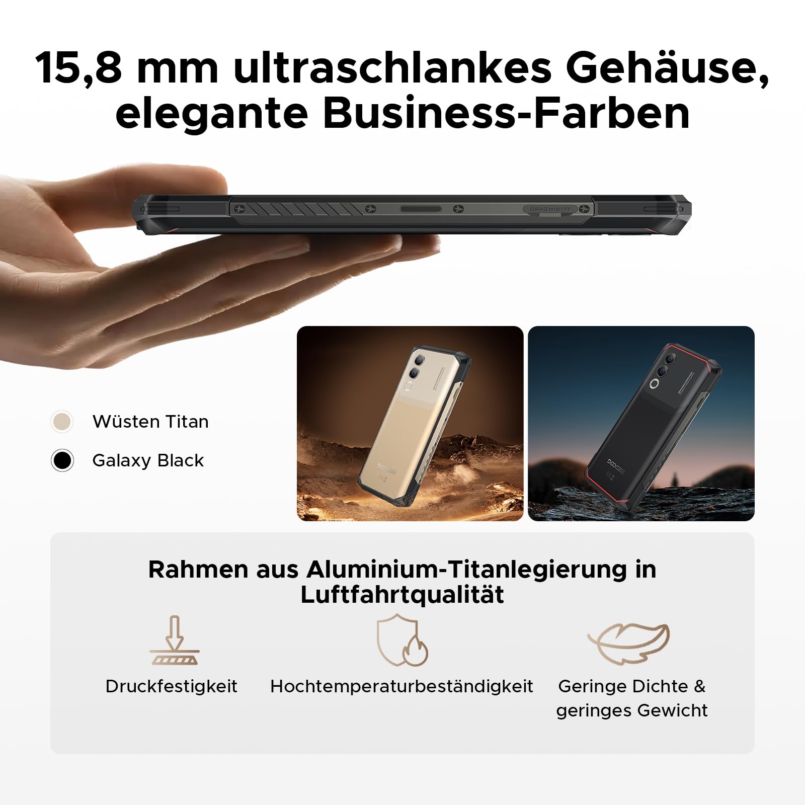 - 👍👍【IP68/IP69K & MIL-STD-810H】DOOGEE Blade 20 Turbo Outdoor Handy ohne vertrag verfügt über die Wasserdichtigkeitsklasse IP68 und die Staubschutzzertifizierung IP69K, sodass es unabhängig von Temperatur, Wasser oder Staub problemlos verwendet werden kann. Es ist MIL-STD-810H zertifiziert, was bedeutet, dass es stoß- und vibrationsfest ist und in extremen Umgebungen eingesetzt werden kann. DOOGEE Blade 20 Turbo 5G Outdoor Smartphone Android 15 ist der perfekte Begleiter für alle Ihre Abenteuer.