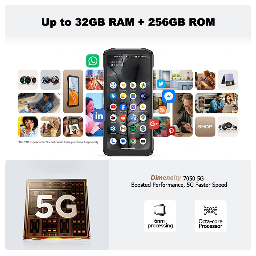 - 【32GB+256GB+1TB+Android 15】DOOGEE Blade 20 Turbo Robuste Outdoor-Smartphone mit Android 15 bietet leistungsstarken 32GB RAM (8 GB physisch + 24 GB erweiterbar) und 256GB internen Speicher, erweiterbar um bis zu 2TB via Micro-SD-Karte - ideal für Apps, Fotos, Videos und große Medienbibliotheken. Das robuste Android-15-System mit Security-Enhanced Linux garantiert flüssige Performance für anspruchsvolle Apps und Spiele bei optimalem Datenschutz, ohne Verlangsamung.