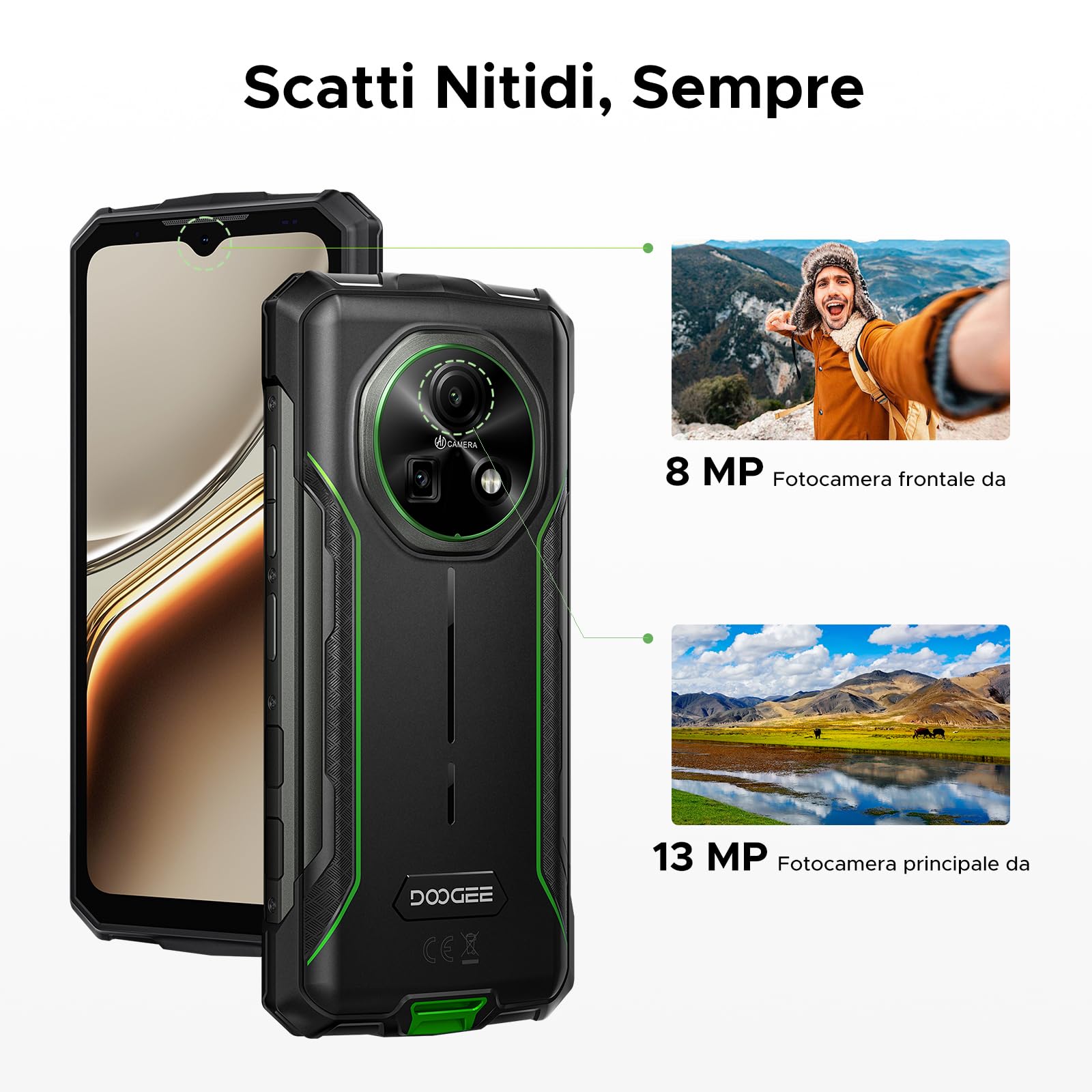 - 6,6 Zoll HD+ Display + 13 MP AI Hauptkamera: Das unzerstörbare DOOGEE Fire 5 Pro Smartphone mit Android 15 Betriebssystem ist mit einem 6,6 Zoll HD+ Display mit 90 Hz Bildwiederholfrequenz ausgestattet, kombiniert mit einer 13 MP AI-Hauptkamera und einer 8 MP Frontkamera. Dieses robuste Smartphone verfügt über ein kompaktes und robustes Display, das scharfe Betrachtungswinkel und makellose Farbgenauigkeit bietet.