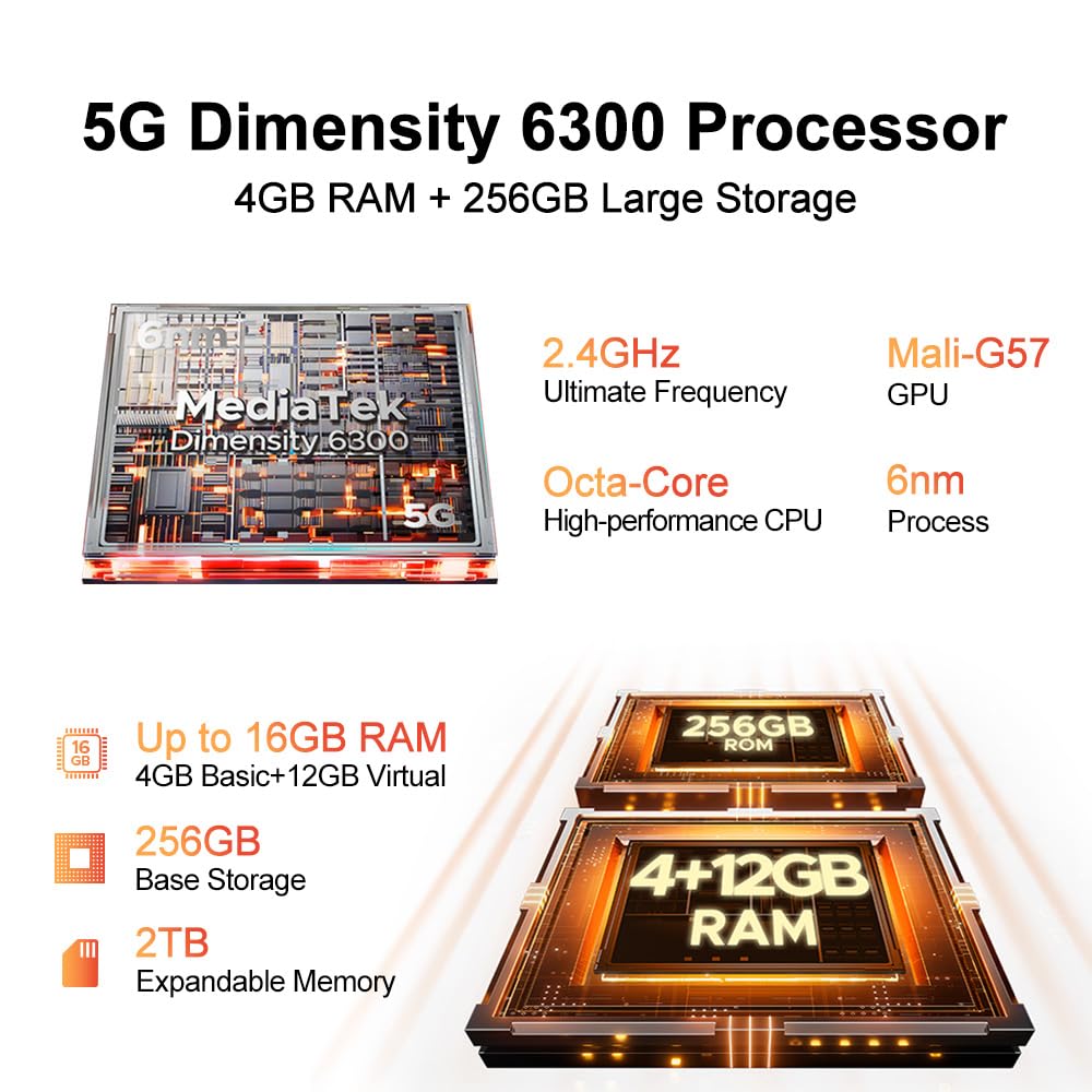• 🚀【16GB RAM + 256GB ROM + 2TB Erweiterbar + Dimensity 6300】Mit 4 GB RAM und 256 GB ROM-basisspeicher zeichnet sich das 5G-Android-Smartphone DOOGEE Fire 7 durch multitasking aus. Das robuste smartphone bietet durch RAM-Erweiterung 12 GB zusätzlichen virtuellen RAM - insgesamt bis zu 16 GB. Zusätzlich bieten die 256 GB interner speicher – erweiterbar per microSD-Karte auf bis zu 2 TB. Das Fire 7 outdoor-handy ohne vertrag mit dem Dimensity 6300 5G-Chip (6nm Octa-Core, 2,4 GHz) ermöglicht dank fortschrittlichem thermomanagement ruckelfreies streaming.