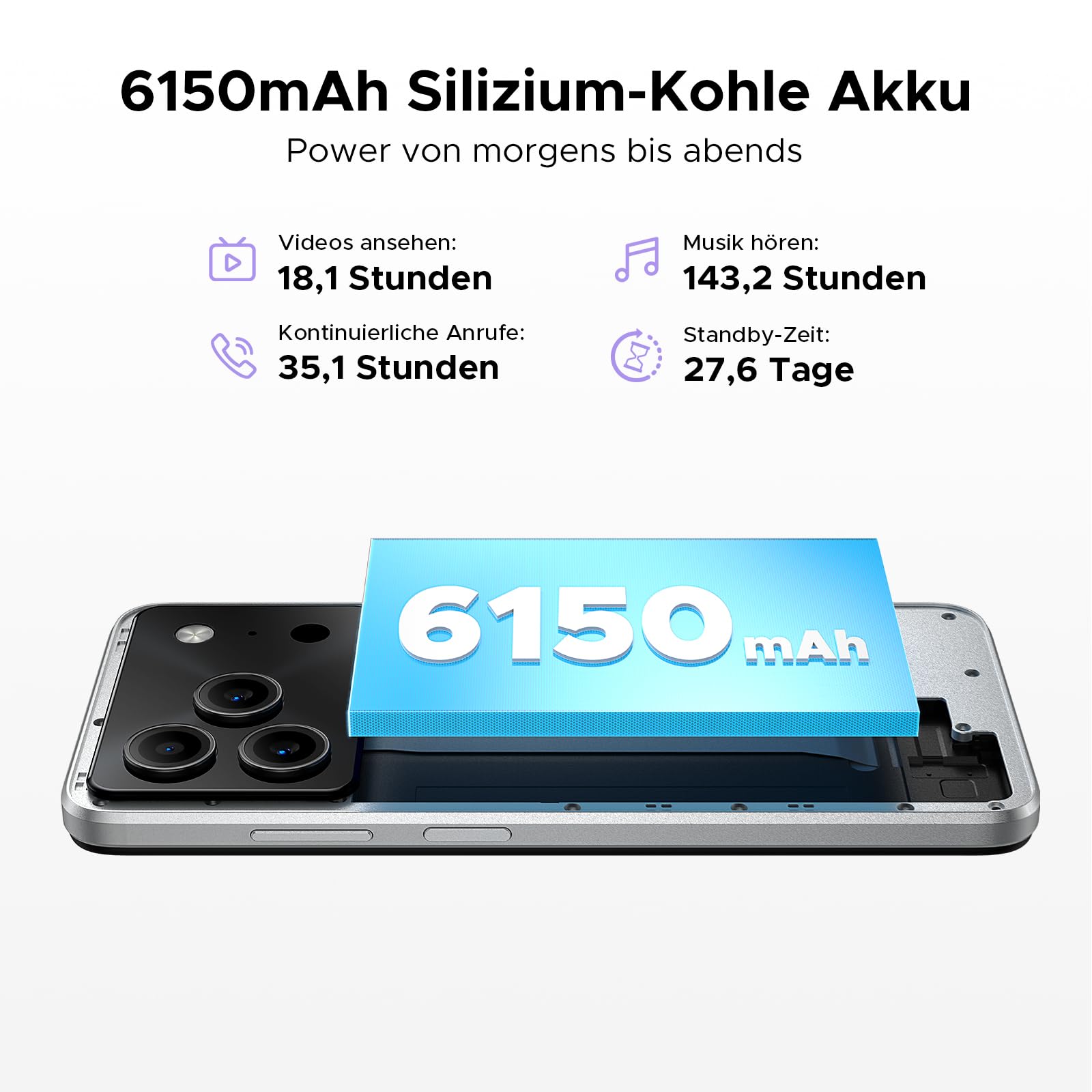 - 🔋【6150mAh Akku+18W Schnellladung+OTG】🔋Das smartphone 6 zoll DOOGEE Note 56 Plus verfügt über einen Silizium-Anoden Akku. In seinem außergewöhnlich schlanken 8,45mm Gehäuse verbirgt sich ein 6150mAh Akku mit hoher Kapazität, der im Vergleich zu herkömmlichen Akkus eine längere Akkulaufzeit bietet. Das smartphones DOOGEE Note 56 Plus unterstützt dieses Gerät die 18W Schnellladetechnologie, wodurch die Ladezeiten erheblich verkürzt und die Produktivität sowohl bei der Arbeit als auch im Alltag gesteigert werden. Dieses mobile phone DOOGEE Note 56 Plus verfügt außerdem über eine OTG Reverse Ladefunktion, mit der andere Geräte wie Kopfhörer oder Lautsprecher mit Strom versorgt werden können.
