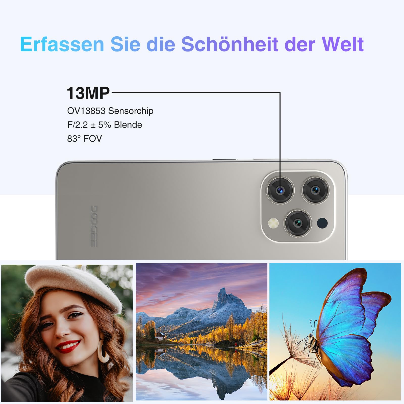 - 13MP+8MP Kamera: DOOGEE N55 handy ohne vertrag ist mit einer 13MP AI Hauptkamera ausgestattet, die mehrere Fotomodi unterstützt. Android 14 smartphoneMit mehreren Fotomodi wie HDR, Nachtmodus und Zeitraffer können Sie Ihrer Kreativität freien Lauf lassen und atemberaubende Fotos aufnehmen. Zusätzliche Funktionen wie Beauty, Pro-Modus, Panorama, Filter, QR Codes und mehr stellen sicher, dass Sie über alle Werkzeuge verfügen, die Sie für perfekte Fotografie benötigen.