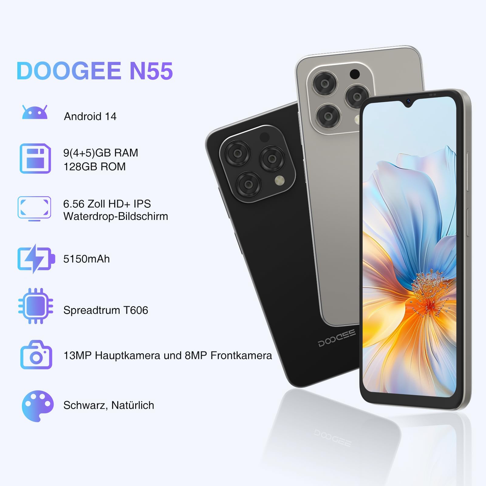 - 128GB, 1TB Erweiterbar, Octa Core: DOOGEE N55 Smartphone verfügt über 9GB RAM (4GB + 5GB RAM-Erweiterung) und 128GB internen Speicher, was nahtloses Multitasking gewährleistet und ausreichend Platz für alle Ihre Apps, Fotos und Videos bietet. Wenn Sie mehr Speicherplatz benötigen, unterstützt es eine TF Kartenerweiterung um bis zu 1TB. Dieses Telefon ist mit einem effizienten Octa Core Prozessor ausgestattet, der alle Ihre Aufgaben problemlos bewältigen kann.