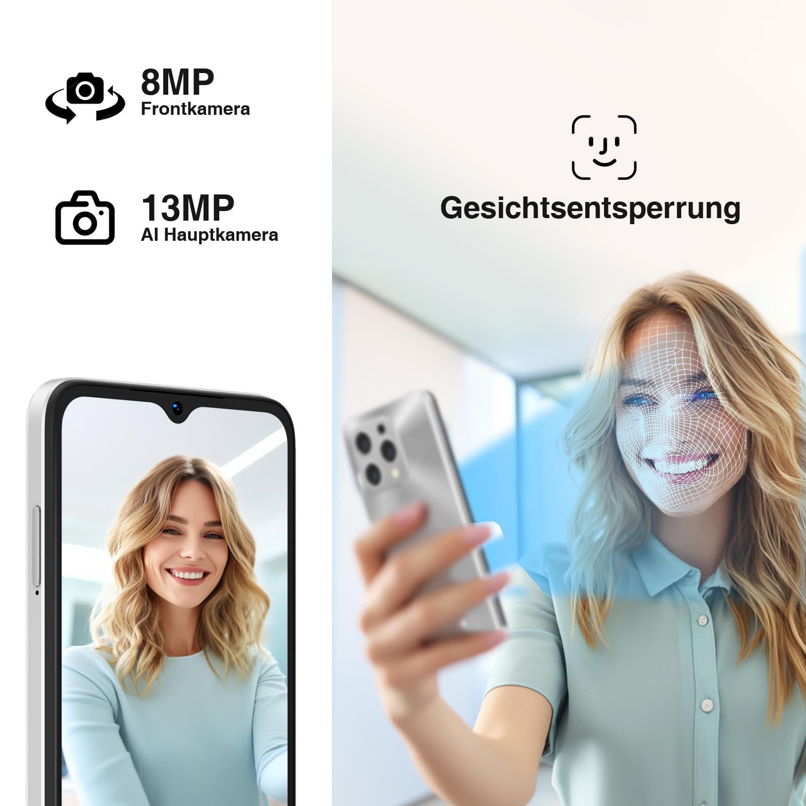 - 【13MP+8MP Kamera, Face Unlock】Das angebotene Mobiltelefon Erfassen Sie die Welt in unglaublichen Details mit der hochwertigen 13MP-Kamera. Mit der KI-Kamera verfügt das handy günstig über fortschrittliche Algorithmen, um unterschiedlichen Fotoanforderungen gerecht zu werden. Ob Nachtaufnahmen, Porträts, professionelle Mode oder Panoramen, DOOGEE N55 Plus ist darauf ausgelegt, in jedem Szenario wunderschöne Bilder aufzunehmen. Machen Sie Ihr simlockfreie handys zur Taschenkamera! DOOGEE N55 Plus unterstützt die Gesichtsentsperrung mit präziser Tiefenerkennungstechnologie, mit der Sie Ihr Telefon entsperren und auf sichere Apps und mehr zugreifen können.