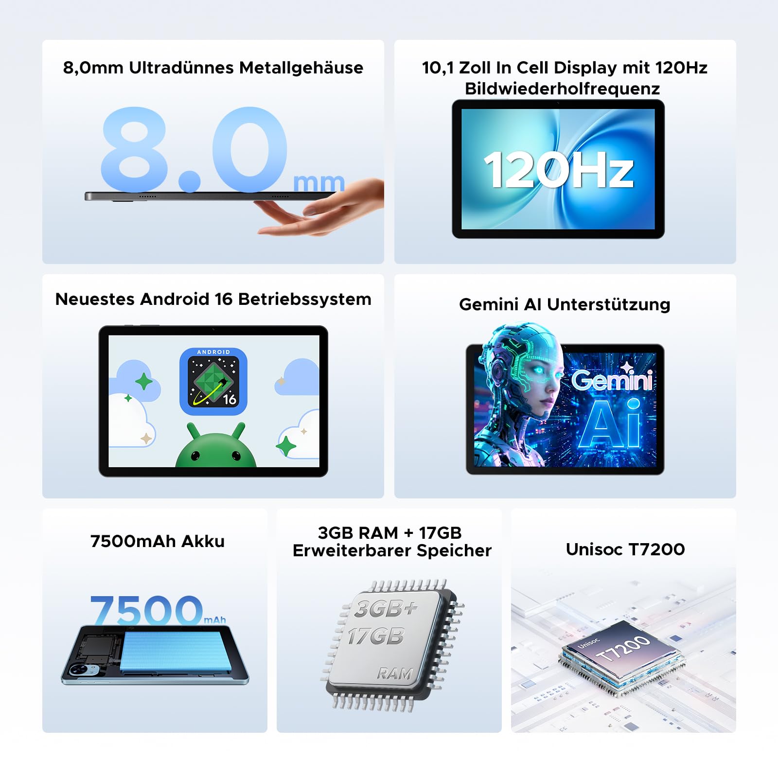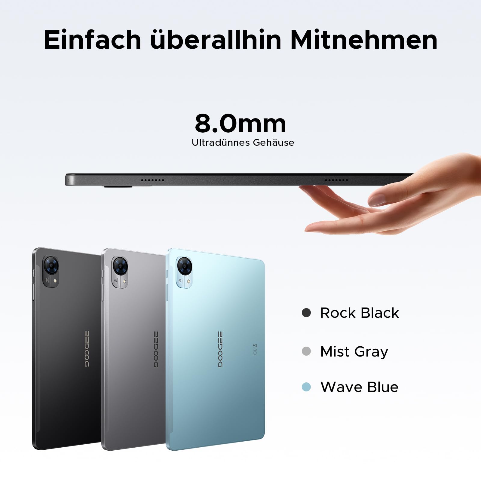 • 🔋【Lange Akkulaufzeit & Schlankes Design: 7500mAh Hochleistungsakku + 8mm Ultradünnes Gehäuse】 DOOGEE Tab G5 Android 16 Tablet 10 Zoll verfügt über einen integrierten 7500mAh Hochleistungsakku, der für eine mehrtägige Akkulaufzeit sorgt und somit Ihren Bedarf an Lernen, Arbeit und Unterhaltung deckt. Das Tablet mit Tastatur besticht durch sein ultradünnes 8,0mm Design und vereint starke Leistung mit einem tragbaren und eleganten Gehäuse für einfache Handhabung und bequemen Transport