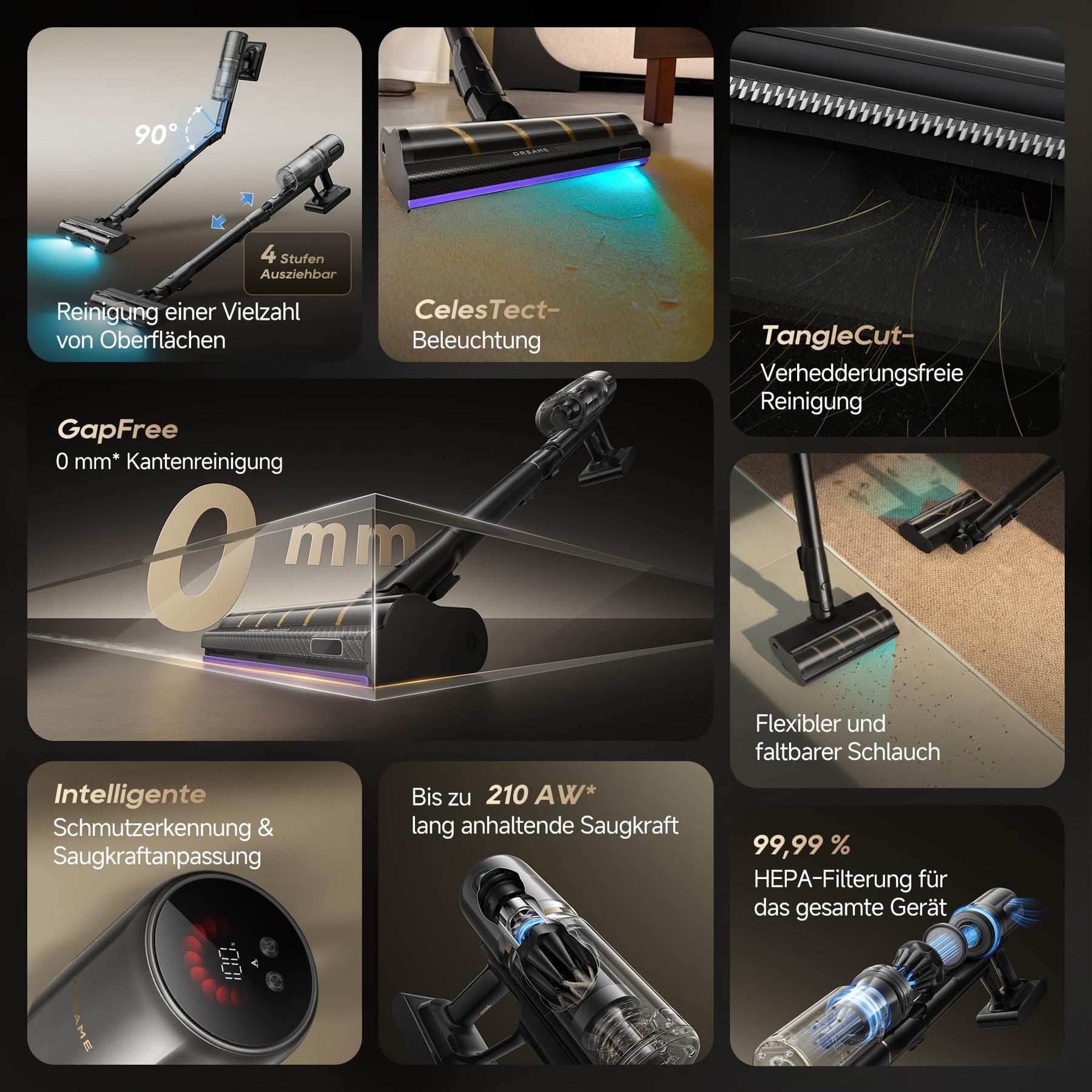 Einzelheiten: Dreame V20 Pro-A Kabelloser Staubsauger, 0 mm reinigung, Ohne Verheddern, Reinigung von Hartböden und Teppichen, Saugkraft: 210 AW, Max. Laufzeit: 90 Min., Filterung: 99,99 %, Reinigung von Tierhaaren