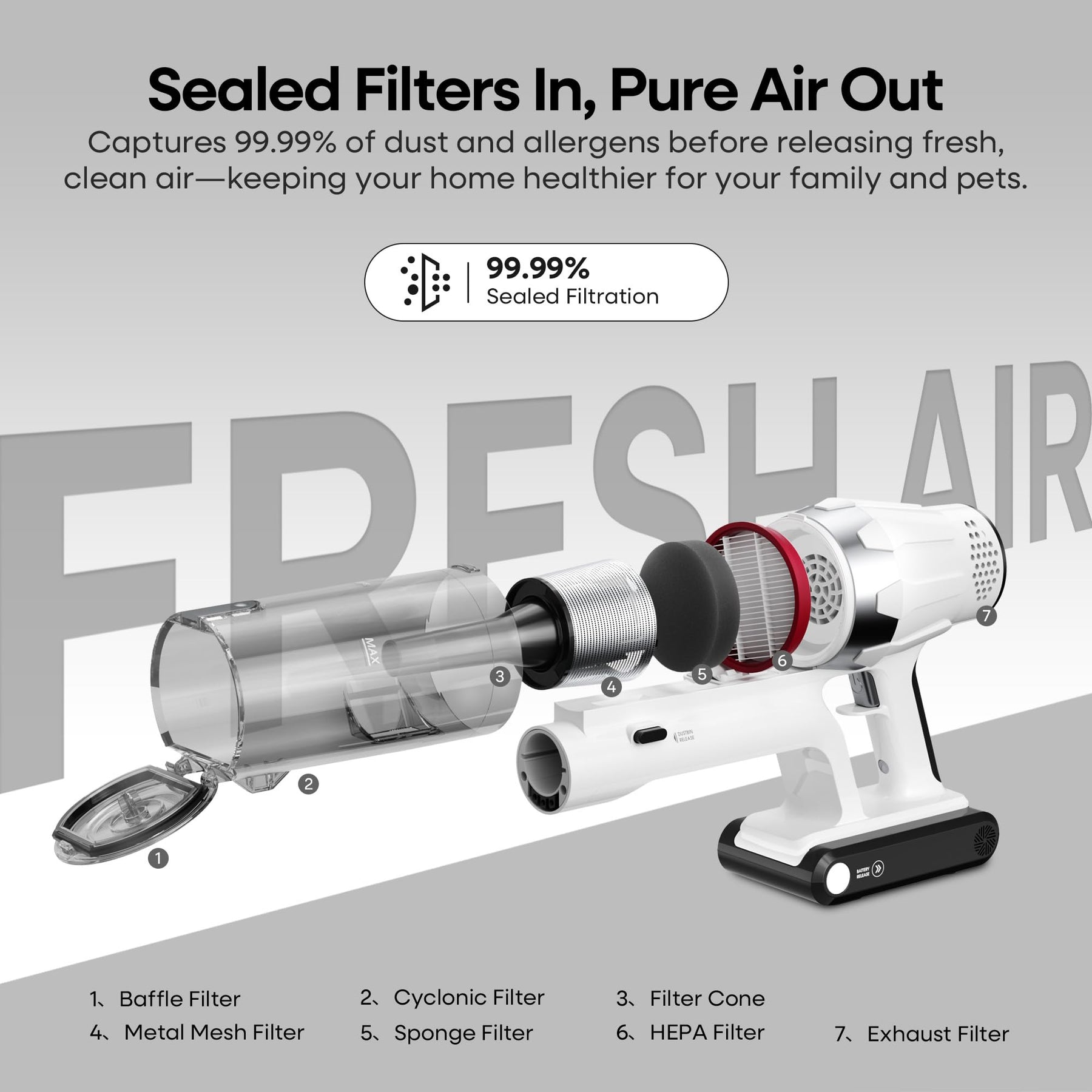 - 【Effizientes Filtersystem & Konstante Saugleistung】Das Ein-Kegel-Filtersystem minimiert Saugverlust und gewährleistet eine dauerhaft starke Leistung. Die 7-stufige Filterung fängt feinen Staub und Tierhaare effektiv auf und sorgt für eine saubere, komfortable Wohnumgebung. Der HEPA-Filter ist vollständig waschbar und wiederverwendbar.