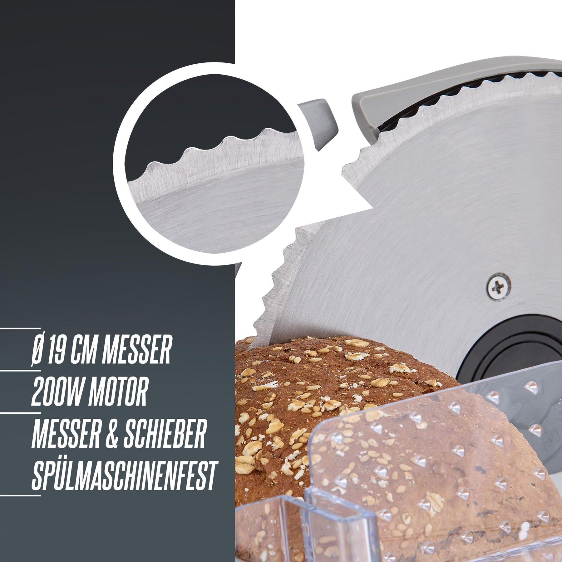 - 💪 LEISTUNGSSTARK- Ein kraftvoller 200W Motor und das Ø19cm scharfe Edelstahl-Rundmesser sorgen für einen gleichmäßigen und scharfen Schnitt. Übrigens können Sie dank der stufenlos einstellbaren Schnittstärke von 0-15mm die Scheibendicke Ihren Bedürfnissen anpassen. So können Brot, Wurst, Käse oder Obst beliebig dick geschnitten werden.
