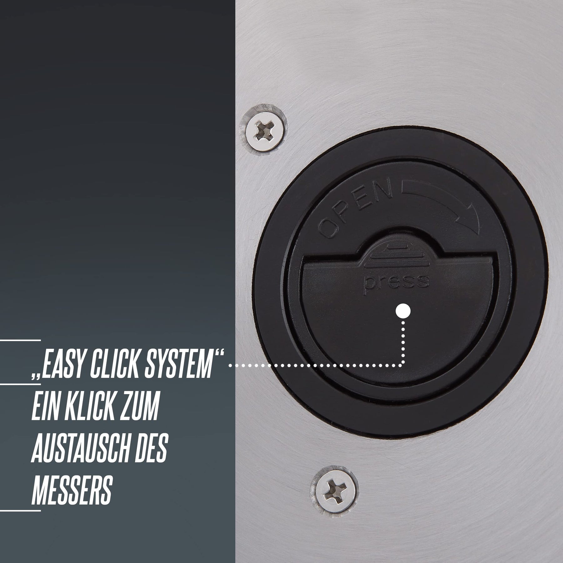 - 💧 SAUBERKEIT-Der Schieber mit Fingerschutz mit der Sie Ihre Lebensmittel gegen das Messer drücken können, sowie das Edelstahlmesser sind für Ihre Spülmaschine geeignet. Das Messer ist unkompliziert durch ein Fingerklick zu entnehmen. Somit wird das Reinigen Ihnen leicht gemacht.