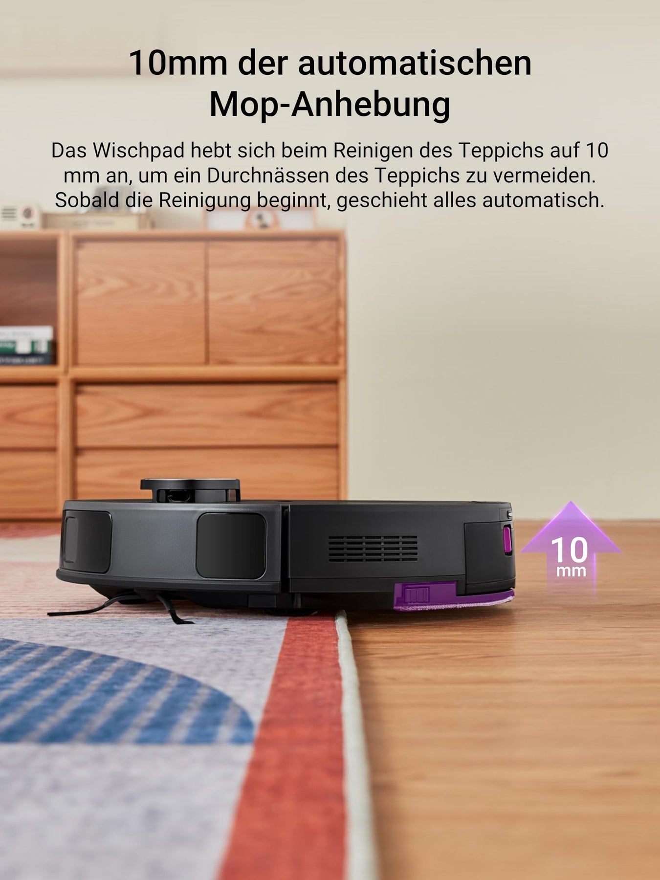 - Hochpräzise Navigation: Die fortschrittliche LiDAR-Navigation in Kombination mit SLAM- Automatische Ultraschall-Teppicherkennung: Intelligente Sensorik erkennt Teppiche in Ihren vier Wänden und hebt den Wischmopp automatisch um bis zu 10mm an; So brauchen Sie sich um Ihren Teppich keine Sorgen machen, denn die bleiben trocken und sauber