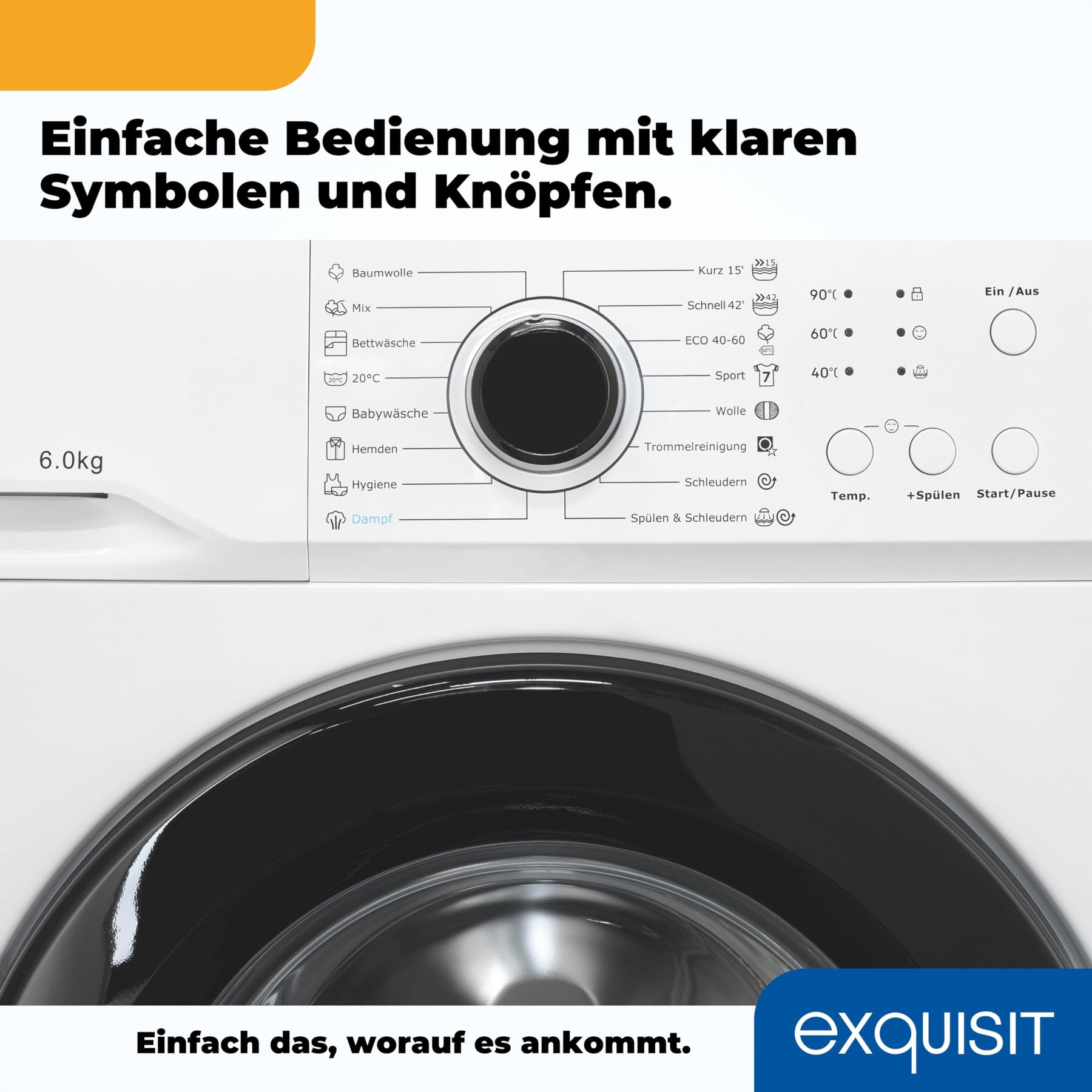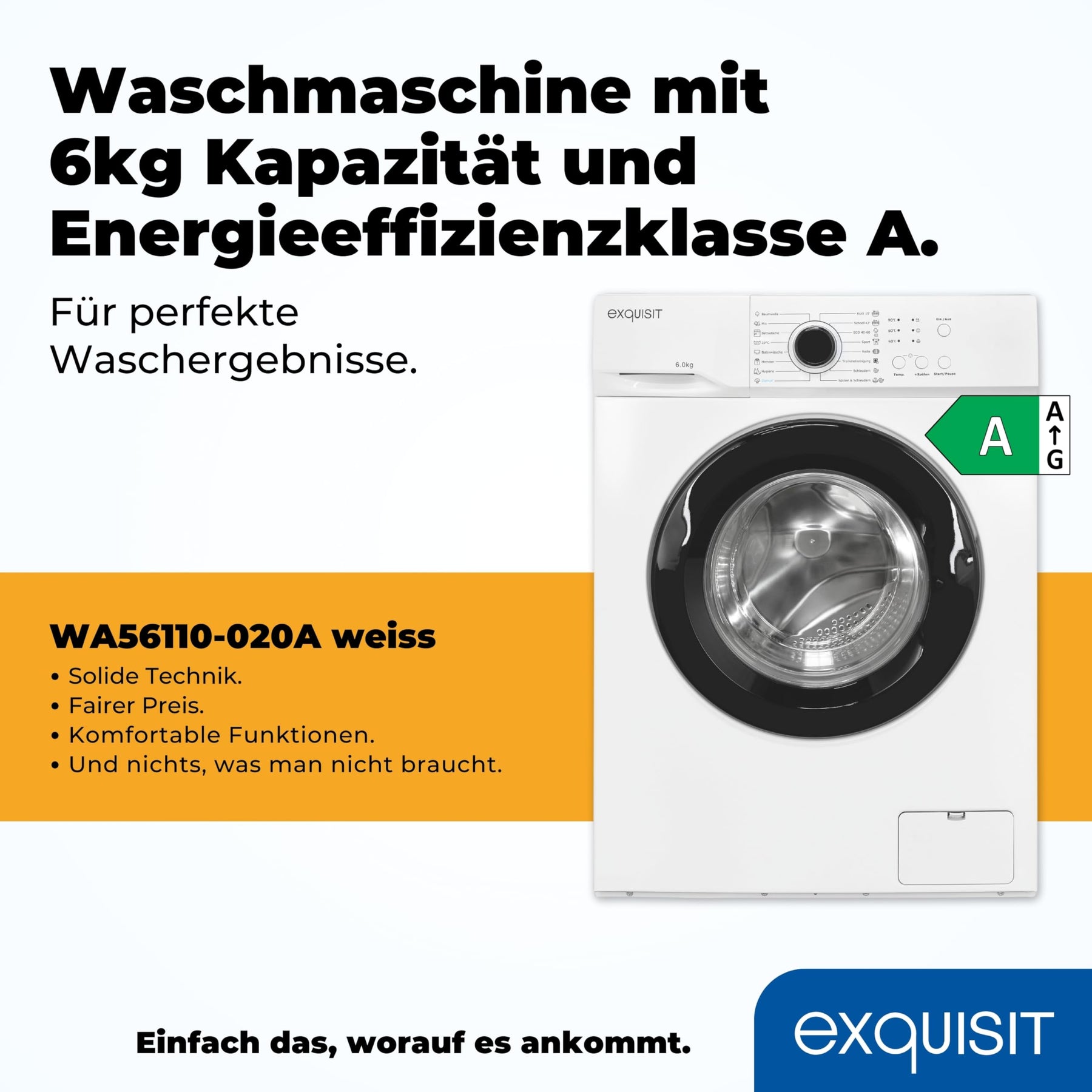 Exquisit Waschmaschine 6kg, Energieeffizienzklasse A, max. 1000 U/min, ECO 40-60, Kurzprogramm, Kindersicherung, 16 Waschprogramme, WA56110-020A weiss