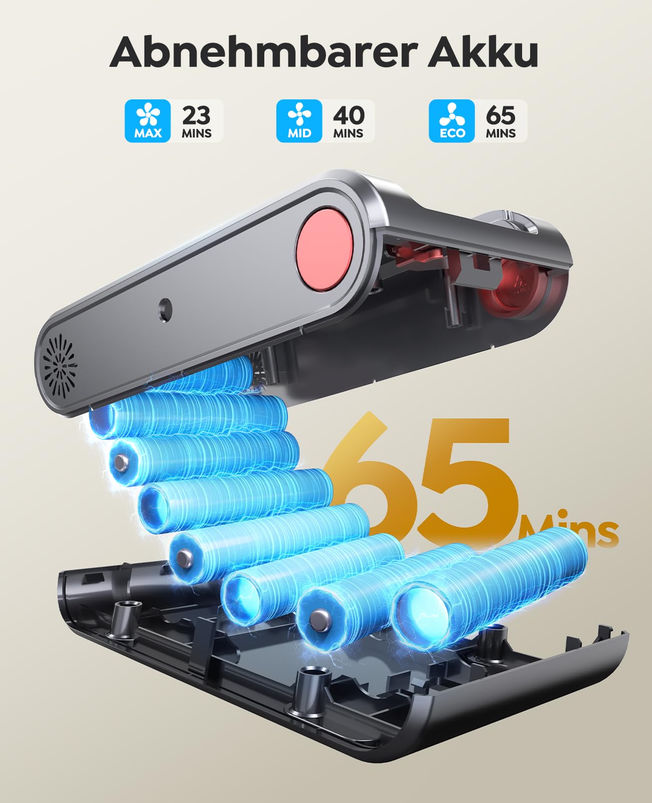 - 🔋【Bis zu 65 Min Laufzeit & Wand-Ladestation: Always Ready】 Bis zu 65 Minuten Laufzeit im Eco-Mode (20 Min. bei Maximalleistung) – meistern Sie auch große Wohnflächen (bis zu 150㎡) ohne Unterbrechung. Die wandmontierte Ladestation sorgt für Ordnung und lädt den Akku in nur 4 Stunden vollständig auf. Ihr handstaubsauger ist immer einsatzbereit. Dieser Shop unterstützt den Kauf eines Zweitakkus.