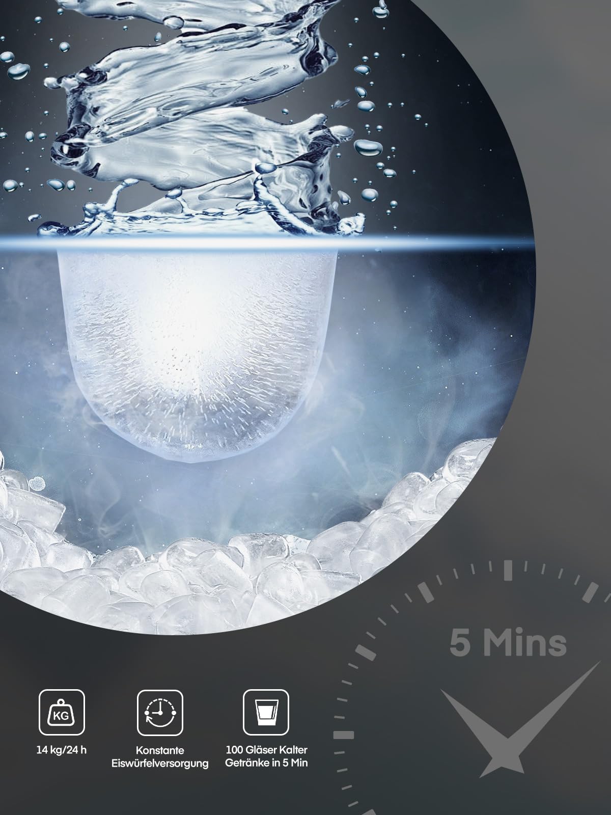 【𝐒𝐜𝐡𝐧𝐞𝐥𝐥𝐞 𝐄𝐢𝐬𝐩𝐫𝐨𝐝𝐮𝐤𝐭𝐢𝐨𝐧】- Diese Eiswürfelmaschine für die Arbeitsplatte kann die erste Ladung frischer Kugel-Eiswürfel in nur 5- 6 Minuten herstellen und innerhalb von 24 Stunden bis zu 14 kg Eis erzeugen. Dies geschieht mit einem 1,5-Liter-Wassertank und einem leistungsstarken Kompressor. Mit seiner beeindruckenden Effizienz stellt dieser Eiswürfelbereiter sicher, dass Sie bei Bedarf schnell auf frisches Eis zugreifen können. Er bietet Ihnen und Ihrer Familie die Bequemlichkeit und Freude der Eisfreiheit!