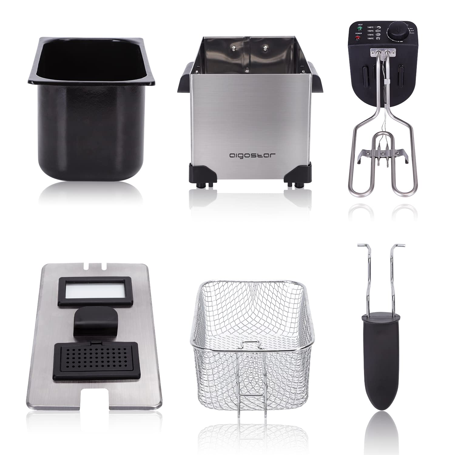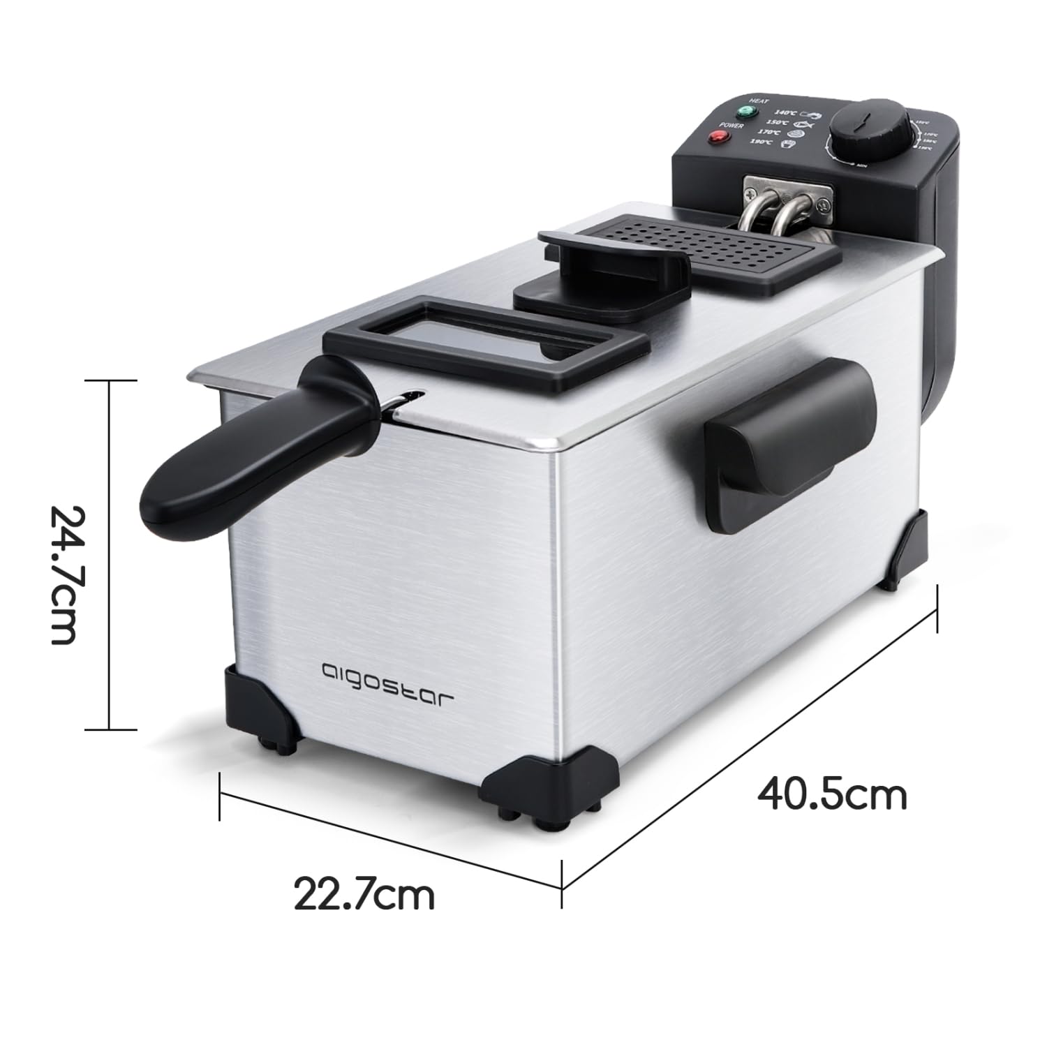 Einzelheiten: Semi-professionelle Fritteuse mit 2200 Watt Fassungsvermögen - Entworfen mit sicheren Materialien für die Küche und mit den besten Qualitäten, Produktdetails: · innen antihaftbeschichtet. · Doppelfilter für Gerüche und Rauch · verschiedene Temperaturstufen · Hergestellt aus Edelstahl und Materialien für professionelle Küchen geeignet - Bereiten Sie köstliche Fritteuse mit der Aigostar Fritteuse zu. + Großes Fassungsvermögen von 3 l, damit Sie Lebensmittel ohne sich Sorgen um mehr machen müssen. + Dank des regelbaren Thermostates können Sie die geeignete Temperatur für Fisch, Gemüse, Kartoffeln usw. einstellen. + Die Fritteuse ist mit einem permanenten Metallfilter ausgestattet, um Gerüche zu vermeiden, so dass jedes Mal, wenn Sie sie verwenden, keine Geruchsmischungen haben.