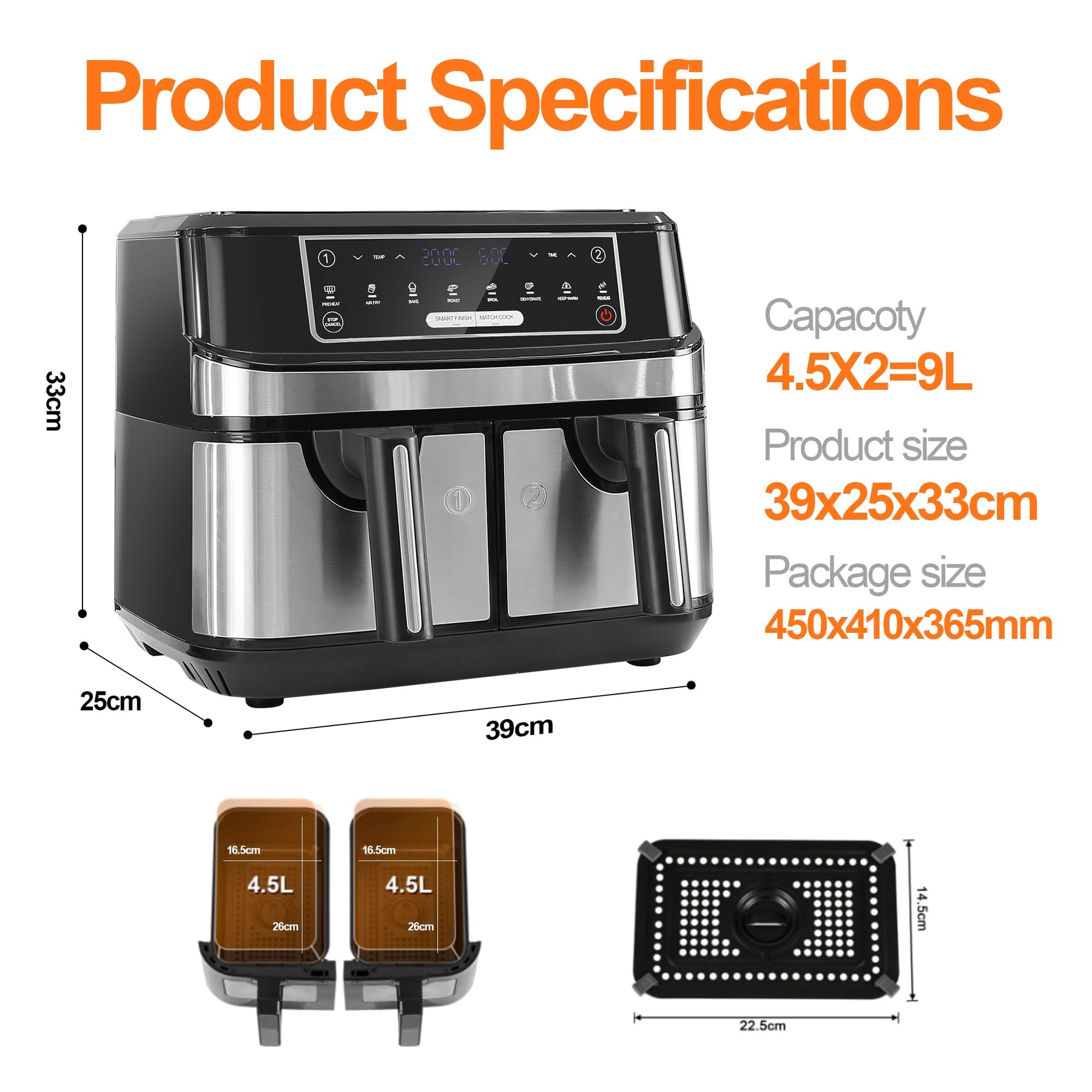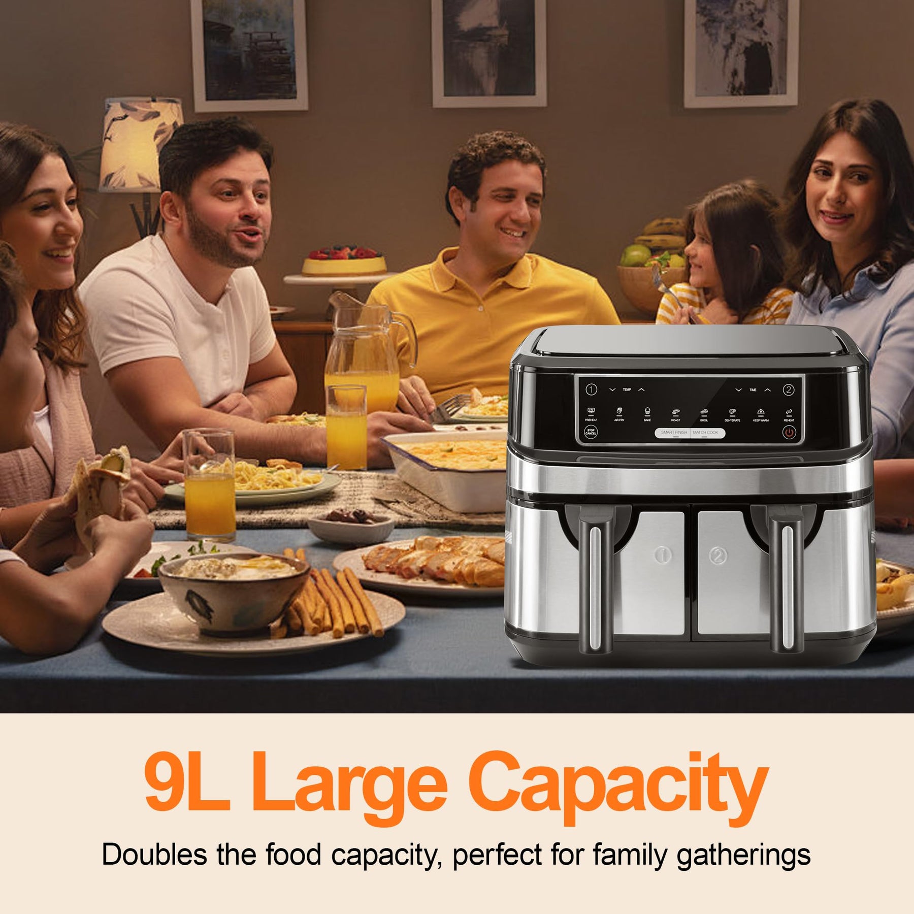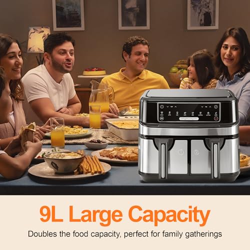 • 【XXL Heißluftfritteuse ohne Öl für die Familie】Mit einem Gesamtfassungsvermögen von 9 Litern kann diese ölfreien Fritteuse gleichzeitig für 6-8 Personen zubereiten. Dies erhöht die Kochleistung erheblich und macht sie zur idealen Wahl für Familienfeiern oder Geburtstagsfeiern.