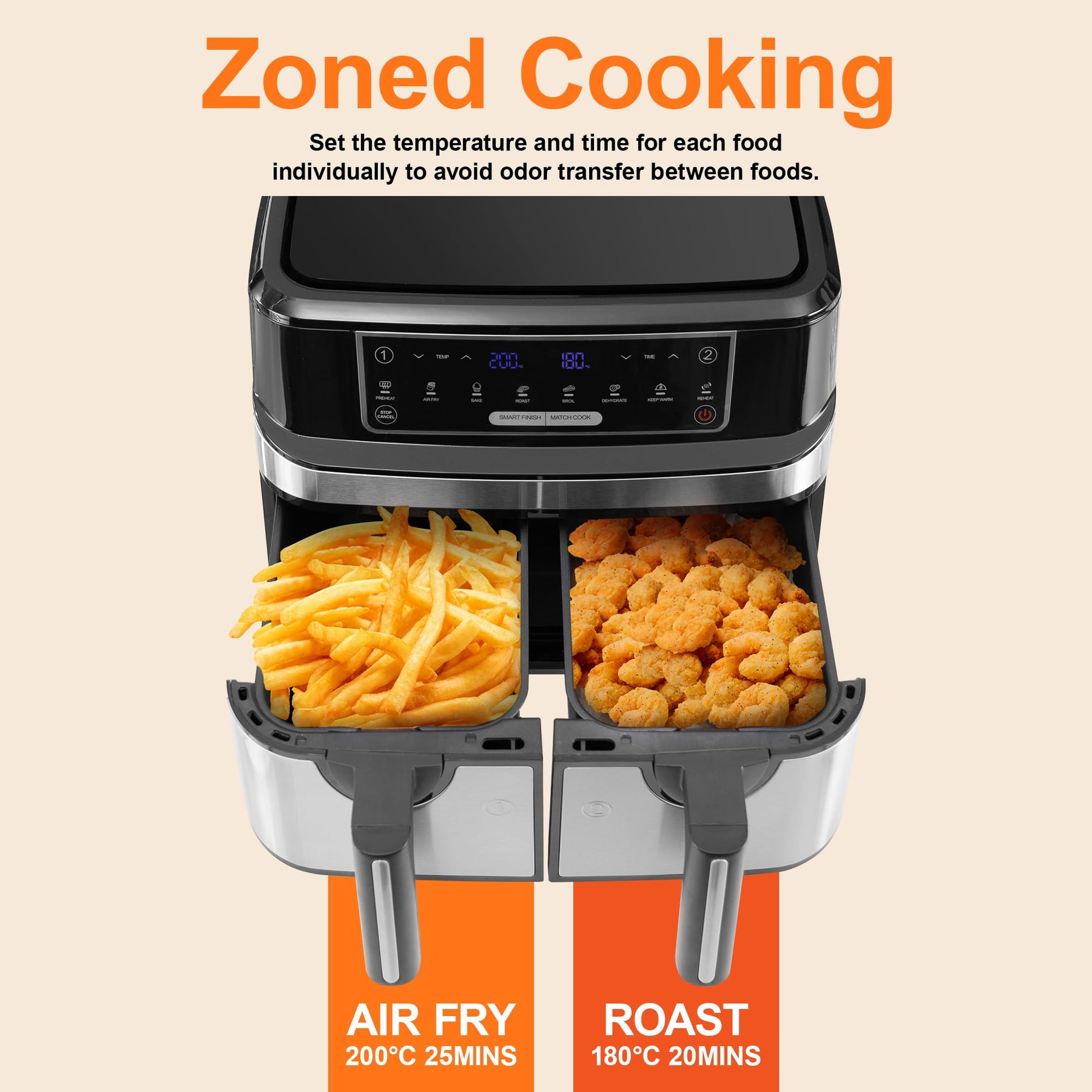• 【Doppelkammer-Heißluftfritteuse】Die Air fryer XXL verfügt über ein Gesamtvolumen von 9 Litern, aufgeteilt in 2x 4,5 Liter Körbe. In der Smart Finish-Modus können zwei verschiedene Programme gleichzeitig abgeschlossen werden. Im Match Cook-Modus müssen Sie nur einmal ein Programm einstellen, und beide Töpfe führen dieselbe Aktion aus.