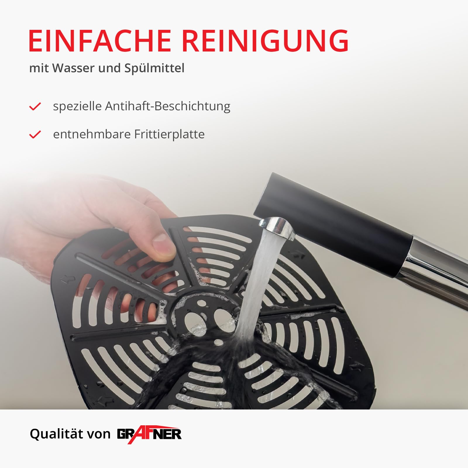 EINFACHE REINIGUNG: Der Garkorb und die entnehmbare Frittierplatte sind mit einer speziellen Antihaft-Beschichtung versehen, sodass eine kinderleichte Reinigung mit Wasser und Spülmittel garantiert ist.