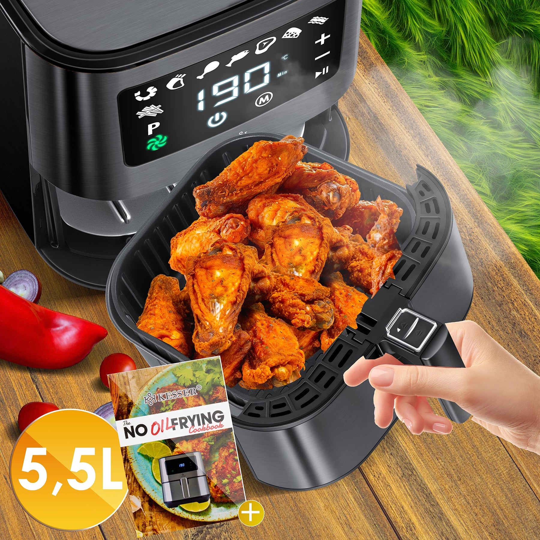 Dank des extra großen Durchmessers können Sie mit Ihrem Aerofryer, mithilfe des mitgelieferten Backblechs, Apfelkuchen, Quiche, Lasagne und andere leckere Dinge herstellen Ideal für Pommes Frites, Hühnchen, Fleisch, Snacks und sogar Pizza. Gesünder, multifunktional und einfach zu bedienen
