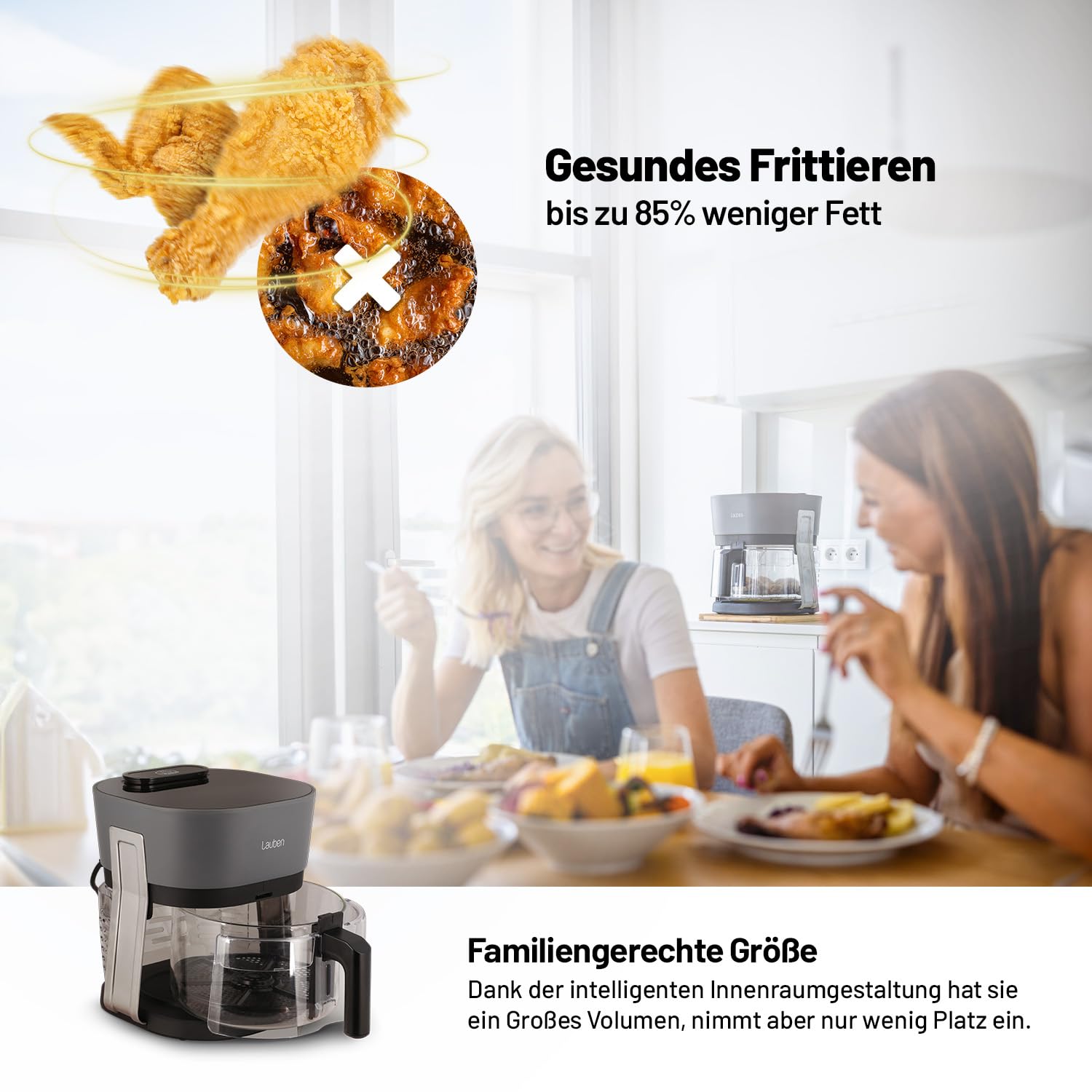 - PERFEKTER GESCHMACK MIT DEM HAUCH VON GESUNDHEIT - Die 4,5 l Heißluftfritteuse ist der perfekte Begleiter für einen gesunden Lebensstil. Beim Heißluftfrittieren wird bis zu 80 % weniger oder gar kein Fett benötigt. Dank der Dampffunktion erhalten Ihre Speisen eine köstliche, knusprige Kruste und schmelzen auf der Zunge, ohne einen Nachgeschmack oder Geruch nach Teflon oder Aluminium. Der Zauber liegt in der einzigartigen Glass&SteamAir-Technologie.