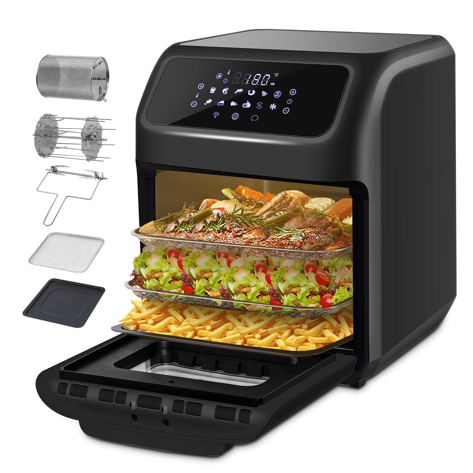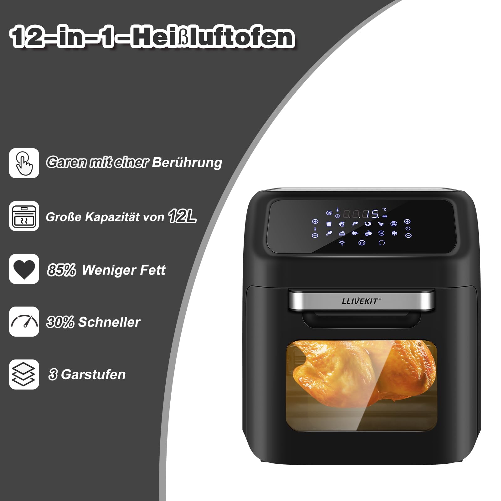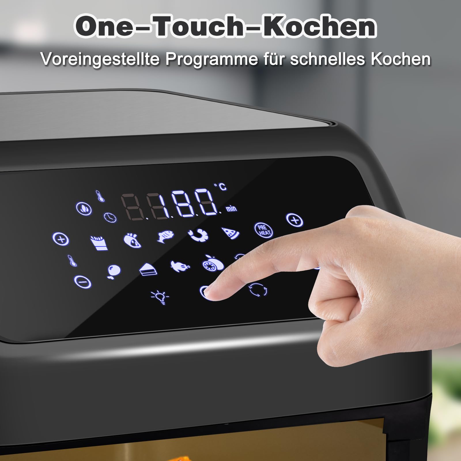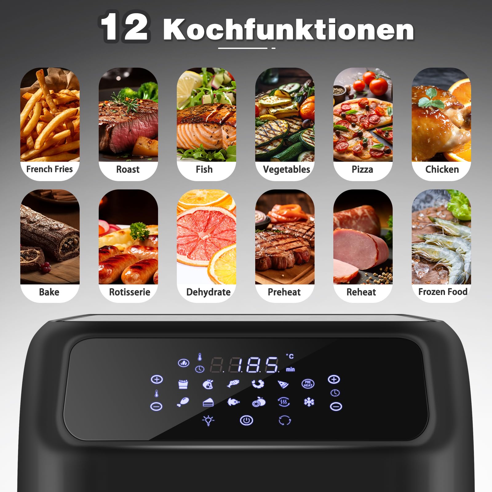 - 【Touchscreen-Steuerung】12 Smart Programme: Pommes frites, Braten, Fisch, Garnelen, Pizza, Hühnchen, Backen, Brathähnchen, Dehydrieren, Aufwärmen, Vorheizen und Auftauen. Mit den 9 voreingestellten Menüs, 3 Zusatzfunktionen, können Sie Speisen einfach und bequem zubereiten