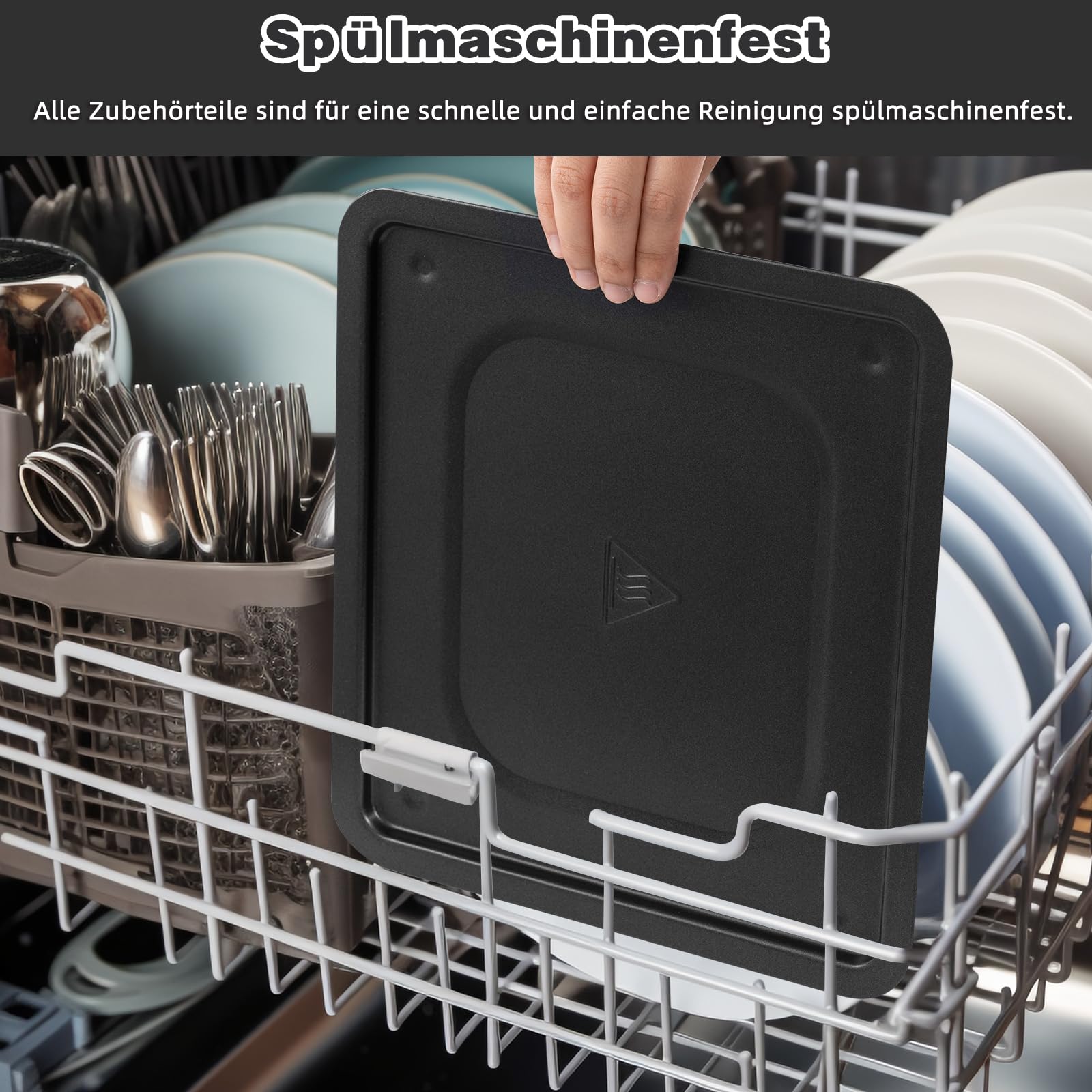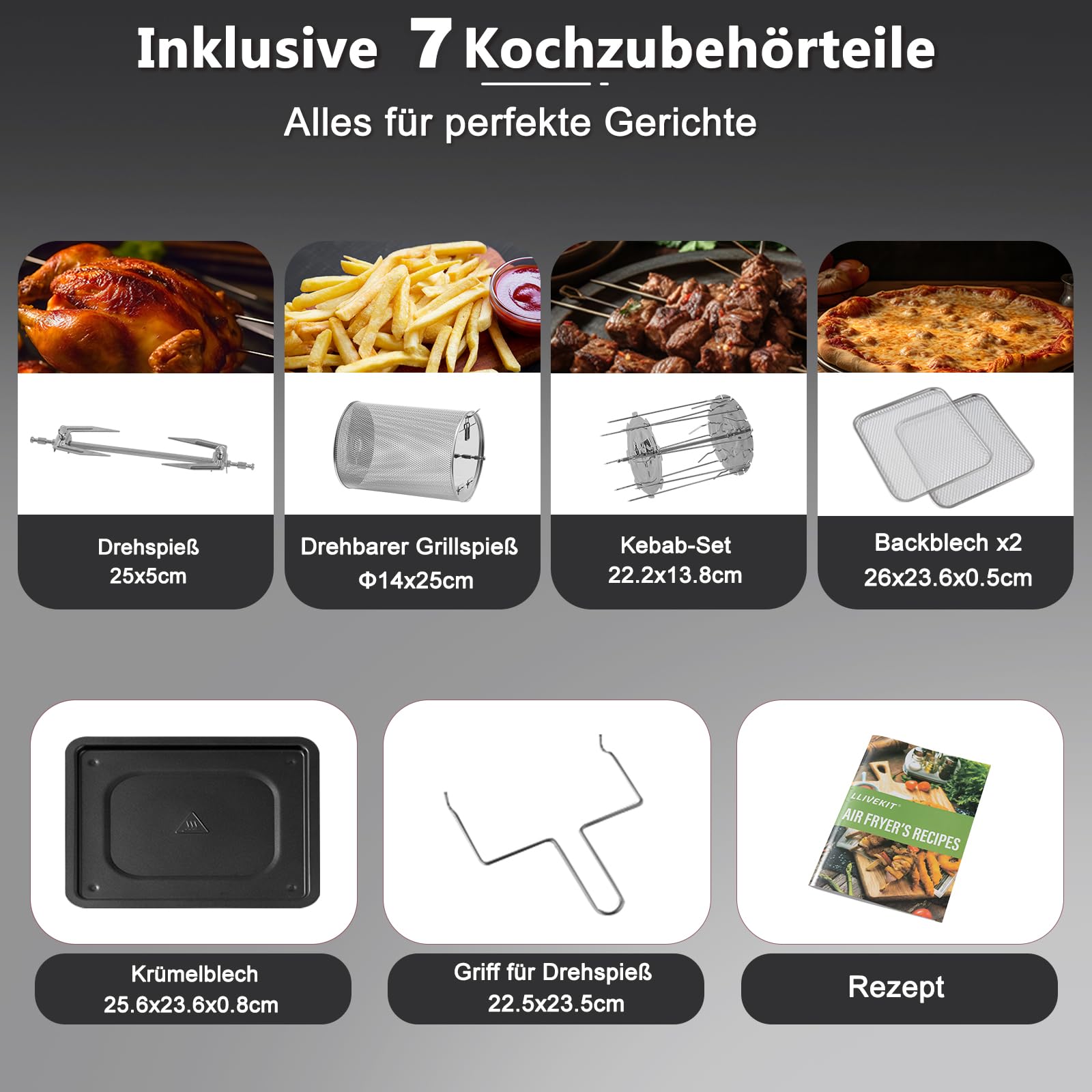 - 【Zubehör kann in der Spülmaschine gereinigt werden】Alle Zubehörteile für Luftfritteusen : 2x Blech für Dehydrierung, 1x Abtropfschale, 1x Trommelkorb für Pommes frites, 1x Geflügel - Drehspieß für Brathähnchen, 8 x Grillspieße für Braten, 1x Drehspieß - Gabeln