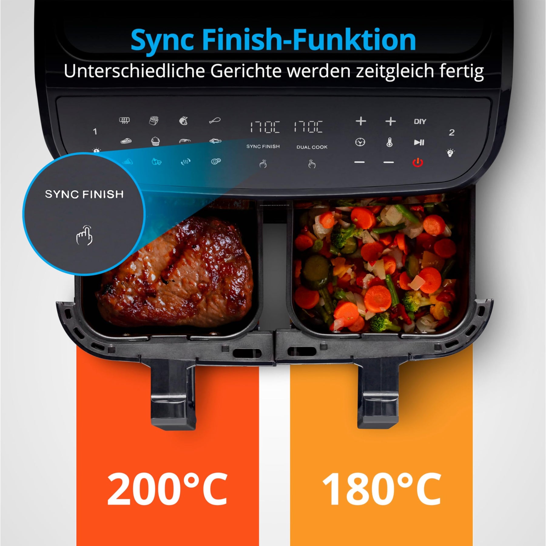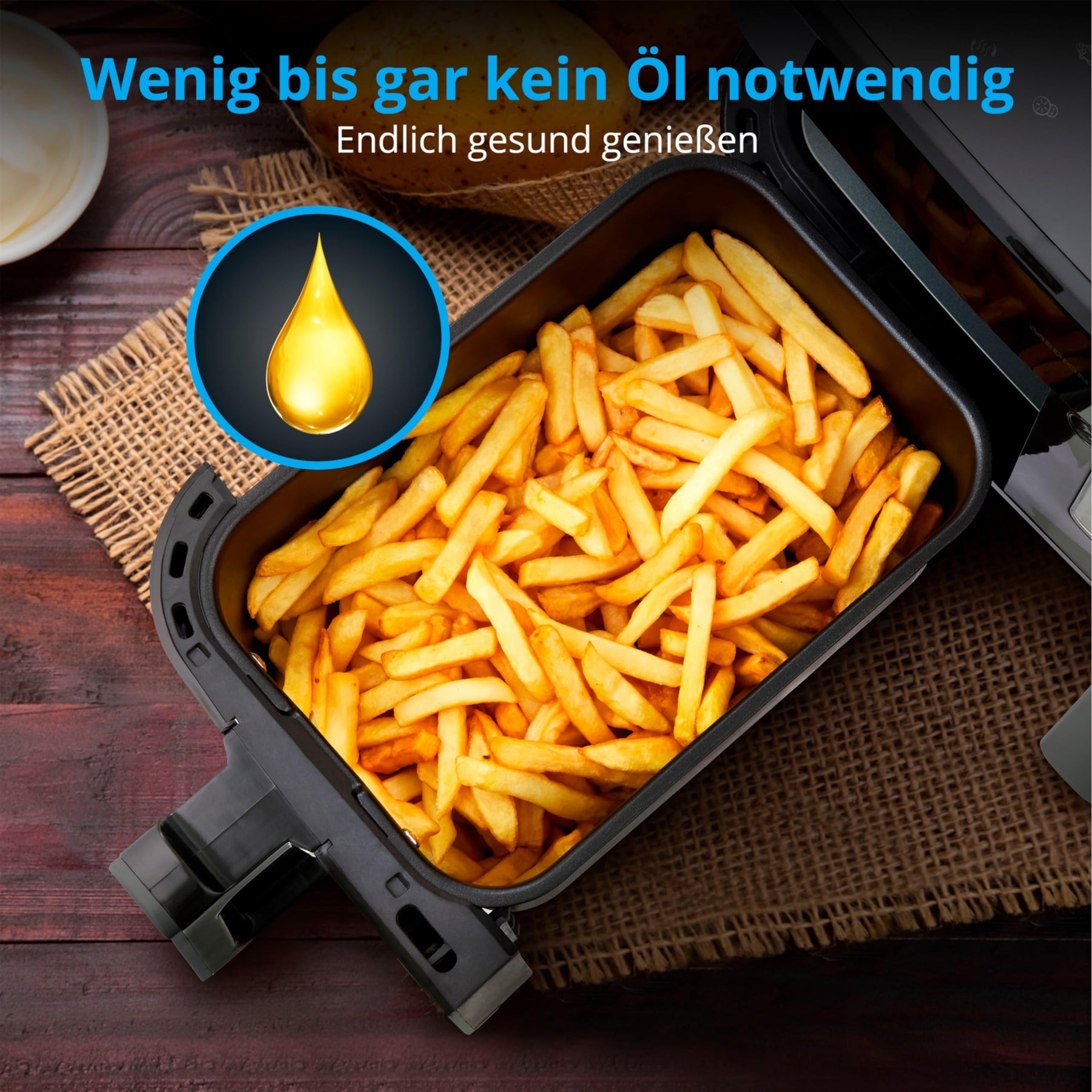 - Heißluftfritteuse zum fettfreien Frittieren mit 2.600 Watt Leistung, 8,7 Liter Frittierkorb, Antihaftbeschichtung und 10 Automatikprogrammen