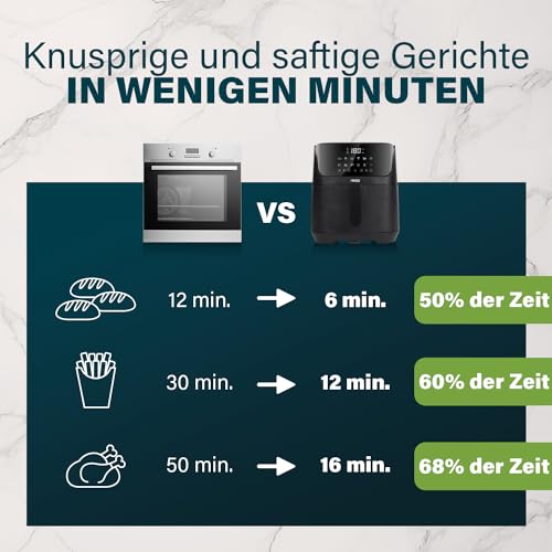• Eine Heißluftfritteuse arbeitet mit der Konvektionstechnologie, die es ermöglicht, dass heiße Luft durch den gesamten Behälter des Geräts zirkuliert. Dadurch werden Fette fast überflüssig, Sie verwenden bis zu 80 % weniger Öl. Sie kochen gesünder - ideal, wenn Sie auf Ihre Ernährung achten, aber nicht den Geschmack verlieren wollen. Essen Sie Pommes ohne Gewissensbisse Sie bleiben goldbraun und knusprig, ohne vor Öl zu triefen. Weniger Fett bedeutet auch, dass weniger Frittiergerüche entstehen