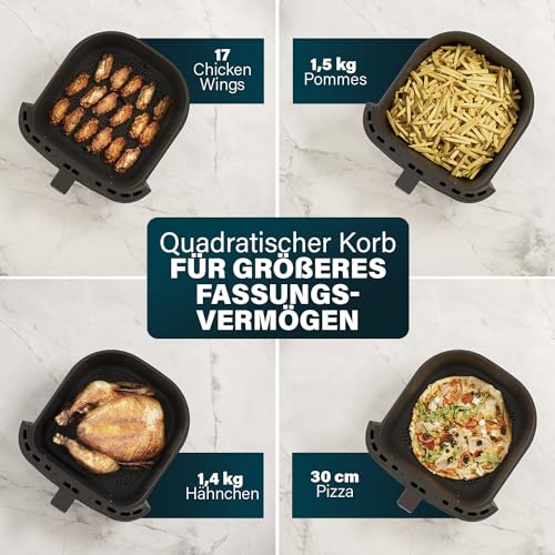 • Mit einem Volumen von 6,5 L kann diese Familien- Heißluftfritteuse bis zu 1,5 kg Pommes frites zubereiten, was etwa 9 Portionen entspricht Sie eignet sich daher besonders für große Familien oder für alle, die gerne Gäste bewirten